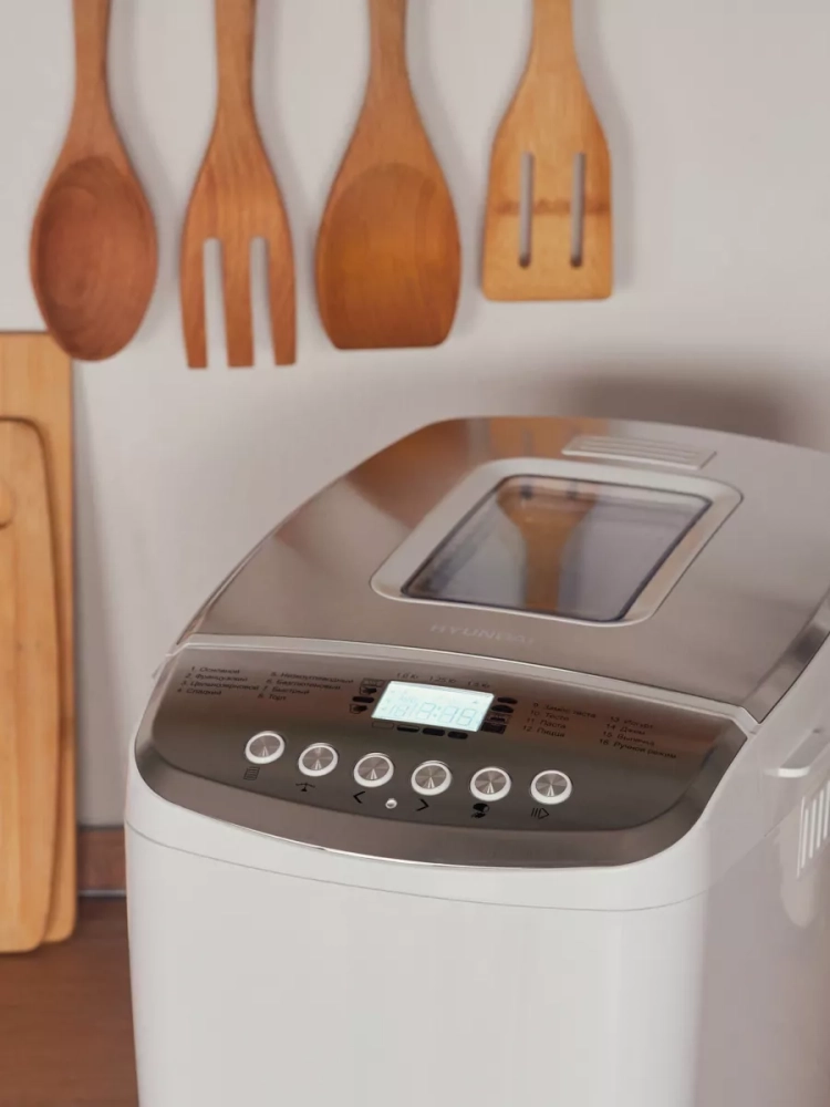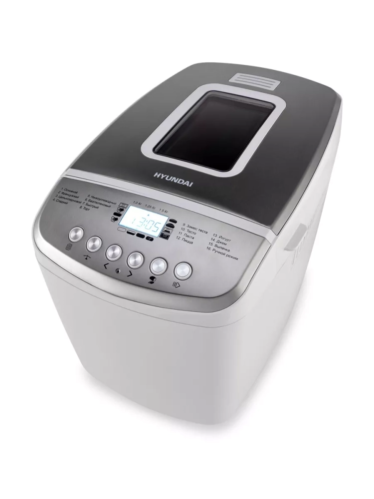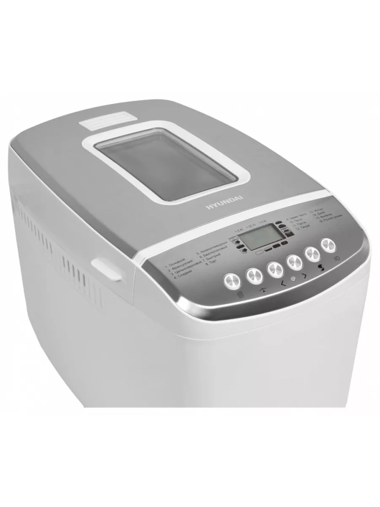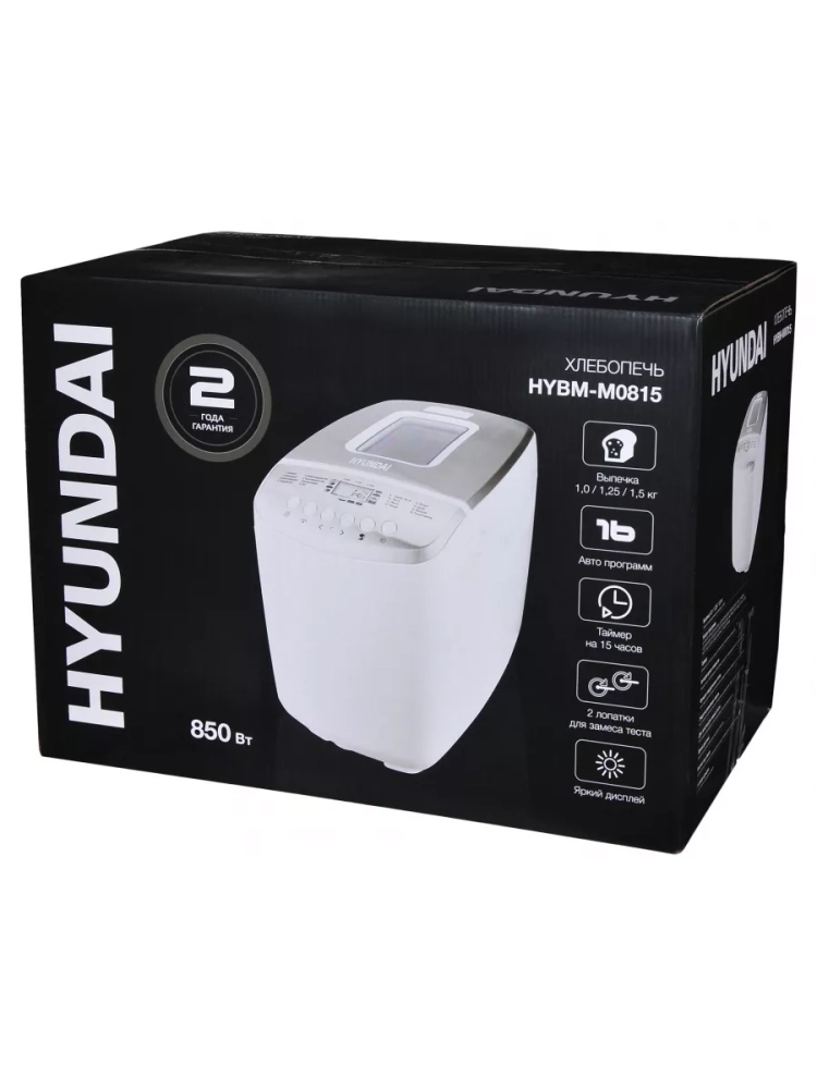 Хлебопечь Hyundai HYBM-M0815 белый/серебристый, мощность 850Вт, вес выпечки до 1500г, форма выпечки буханка, программ приготовления: 16. Приятная белая подсветка дисплея. 2 лопасти для равномерного замеса теста большой выпечки. размер корзины для хлеба 22х12,4х15,3 cm. Дополнительно в комплекте: Мерный стакан, мерная ложка,2 лопасти для замешивания теста, крюк для извлечения лопасти. Регулировка веса выпечки. Книга рецептов.