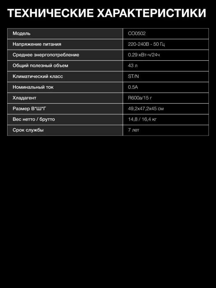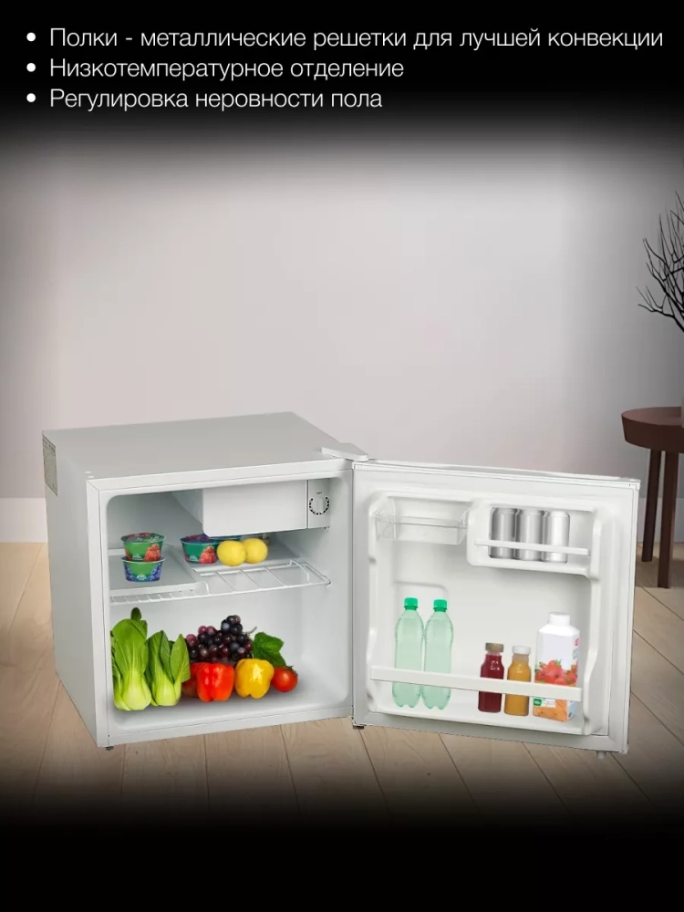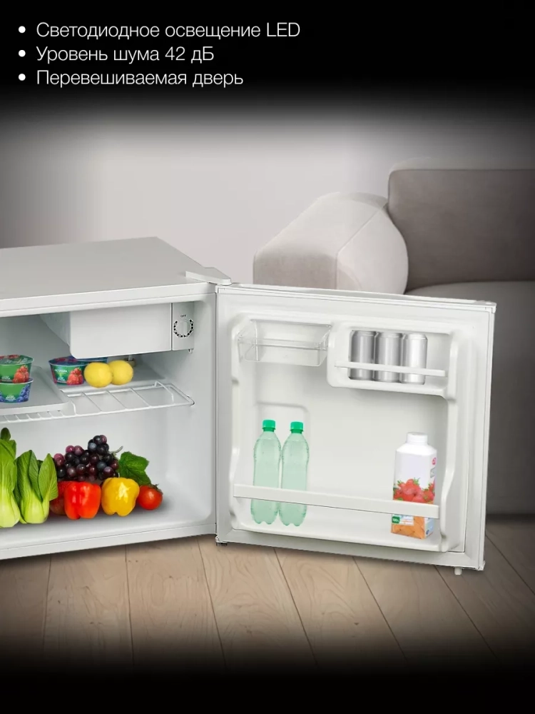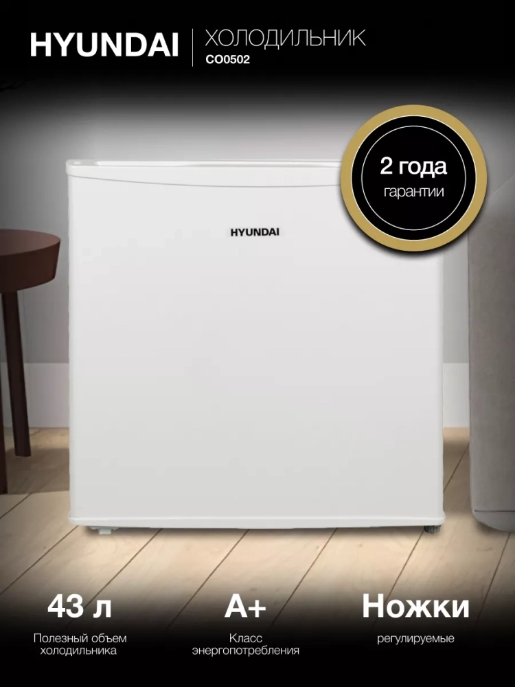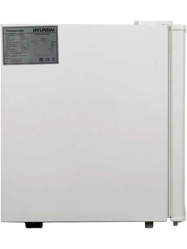 Холодильник Hyundai CO0502 белый, однокамерный, общий объем 45л, с ручной разморозкой холодильной камеры, без морозильной камеры, расположение морозильной камеры: морозильная камера отсутствует