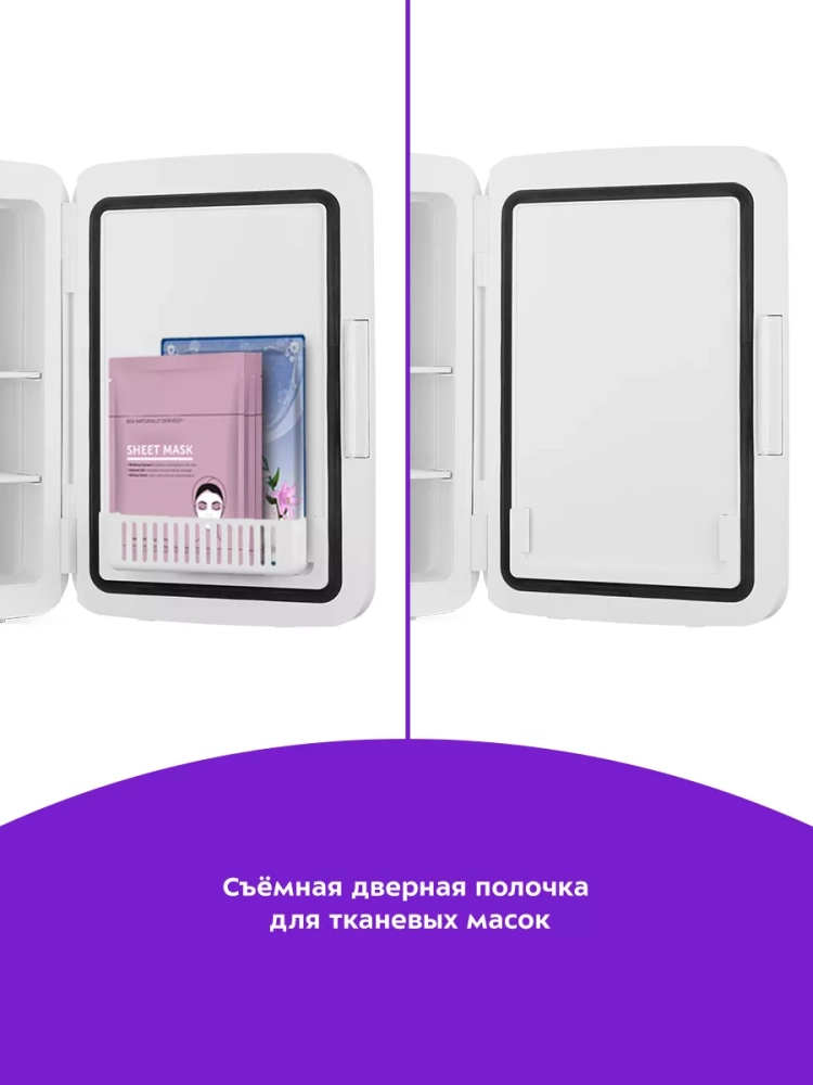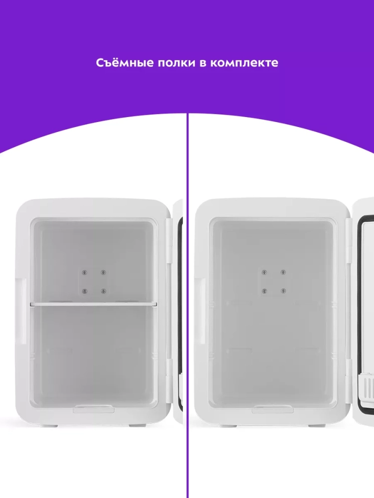 Благодаря наличию сетевого и автомобильного шнура в комплекте вы можете использовать холодильник дома или взять его в поездку на машине. Дверная полка и полки холодильной камеры позволят вам рассортировать косметику.