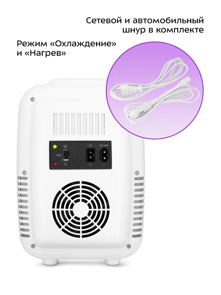 Благодаря наличию сетевого и автомобильного шнура в комплекте вы можете использовать холодильник дома или взять его в поездку на машине. Дверная полка и полка холодильной камеры позволят вам рассортировать косметику.