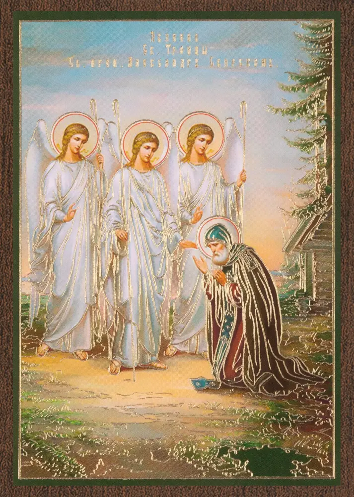 Икона "Явление Св.Троицы Александру Свирскому" 6х9 на МДФ-6