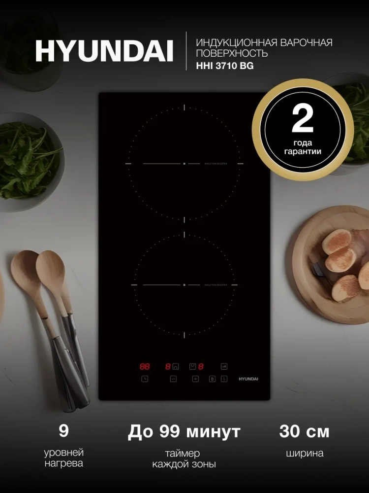 Встраиваемая индукционная варочная панель Hyundai HHI 3710 BG – оптимальное решение для студий и кухонь небольшой площади. Благодаря ширине рабочей поверхности 30 см она не займёт много места.