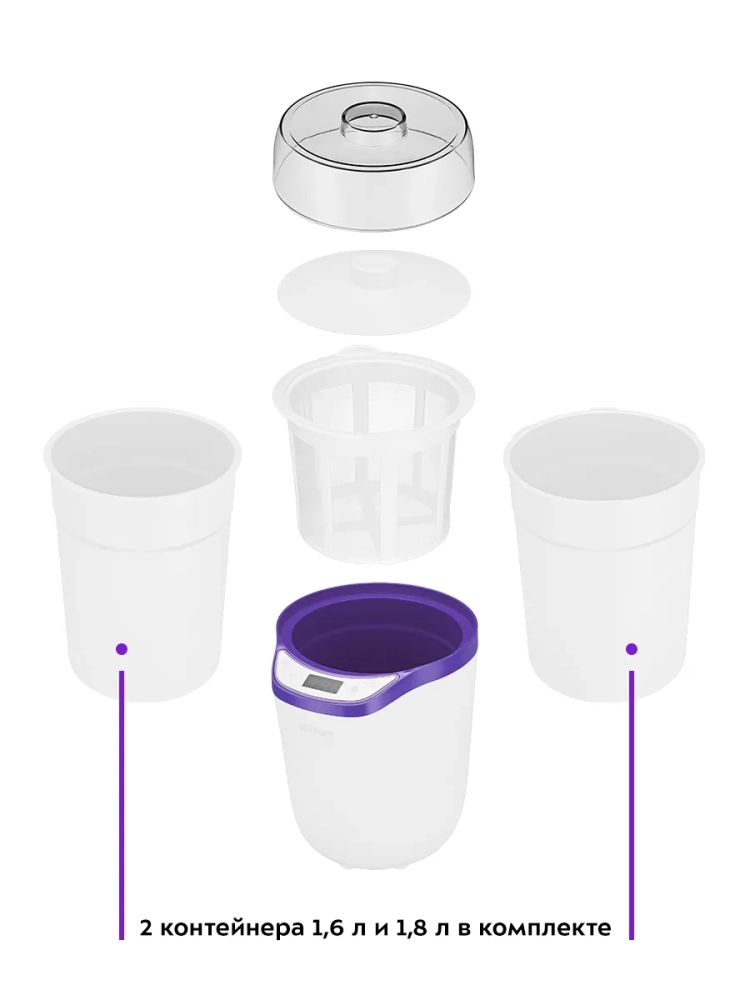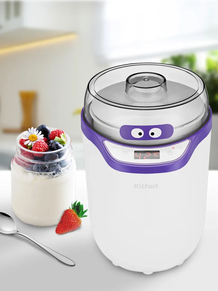 Йогуртница Kitfort КТ-2077 — это идеальная техника для приготовления домашнего йогурта. С помощью этой йогуртницы вы сможете легко приготовить вкусный и полезный продукт, используя закваску и молоко. В комплект входят два контейнера емкостью 1,8 литра и 1,6 литра с крышками, что позволяет хранить готовый йогурт с пробиотиками в холодильнике. Благодаря ситу можно приготовить греческий йогурт или творог. Эта модель оснащена таймером и шестью предустановленными программами, а также одной программой с возможностью установки времени приготовления от 1 до 99 часов и температуры от 25 до 65 градусов Цельсия. Йогуртница равномерно нагревает смесь ингредиентов, поддерживая заданную температуру для оптимального результата. Греческий йогурт отличается своей густой текстурой благодаря отделению сыворотки. Он содержит меньше сахара и больше белка по сравнению с обычным йогуртом, что делает его более питательным вариантом для вашего рациона. Приготовление в Kitfort КТ-2077 очень просто: смешайте молоко с закваской "наринэ" или другой пробиотической смесью в контейнере, установите его в приборе, выберите программу или настройте время и температуру вручную — всё остальное сделает техника за вас! После завершения процесса прибор автоматически отключится. Йогуртница Китфорт — это не только удобство использования благодаря продуманной конструкции крышки и вместительным контейнерам на несколько литров каждый; она также обеспечивает равномерное распределение тепла внутри устройства для достижения наилучших результатов при приготовлении различных кисломолочных продуктов.