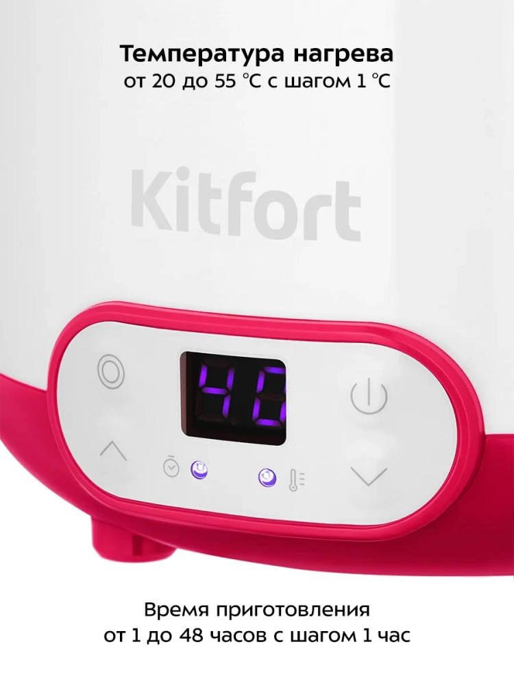 Йогуртница Kitfort КТ-6402 предназначена для приготовления вкусного и полезного домашнего йогурта, творога, питьевого йогурта или любого другого молочного продукта. Прибор укомплектован чашей на 1,5 л с пластиковой крышкой. Готовый йогурт можно хранить в холодильнике прямо в чаше.