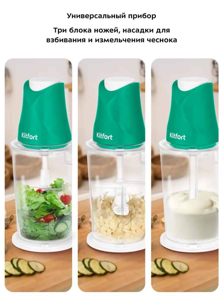 Измельчитель «3 в 1» Kitfort КТ-3514 — устройство для быстрого измельчения мяса, твердого сыра, овощей, трав, чеснока, ягод и многих других продуктов. Три блока двойных ножей измельчают ингредиенты практически по всей высоте чаши. Процесс измельчения пищи происходит намного быстрее, чем при использовании ручных кухонных приспособлений. Любой салат будет готов за считанные минуты. Все что потребуется — подготовить продукты для резки и следить за степенью измельчения.