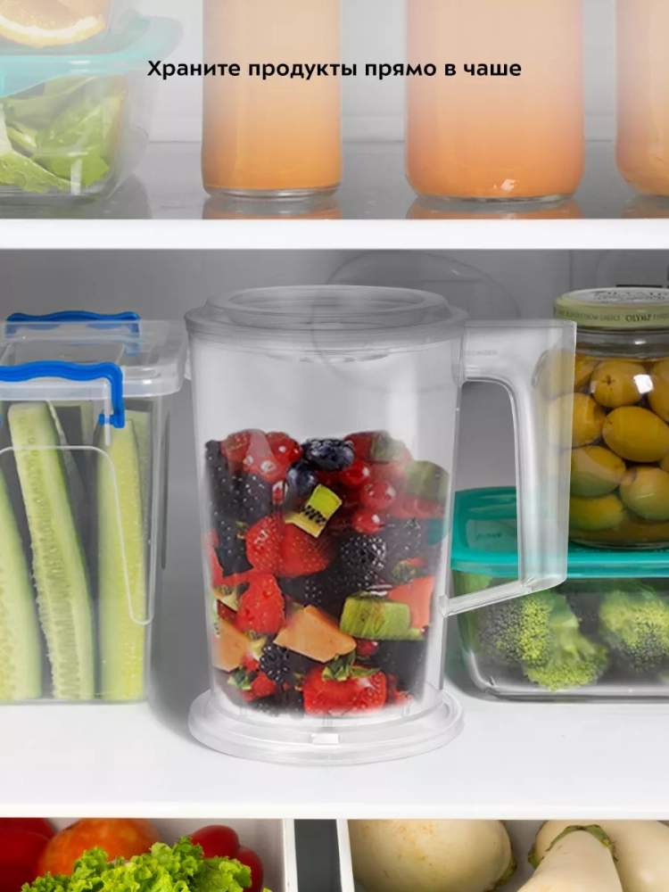 Чаша измельчителя выполнена из прозрачного пластика, что дает возможность наблюдать за процессом и контролировать степень измельчения. Чашу можно закрыть крышкой и использовать для хранения продуктов в холодильнике. Нескользящая подкладка снизу чаши уменьшает скольжение прибора по столу, а также снижает вибрацию и уровень шума при работе.