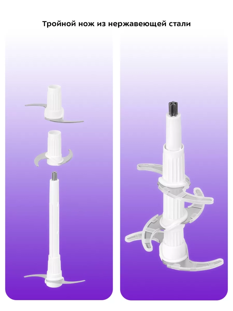 В комплекте также есть насадка для взбивания и насадка для измельчения чеснока.
