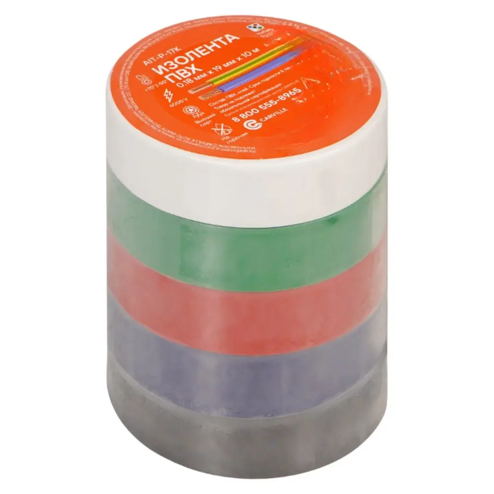 Изолента ПВХ, набор 5 шт.(син.,чёр.,кр.,зел., бел.), 19 мм*10 м