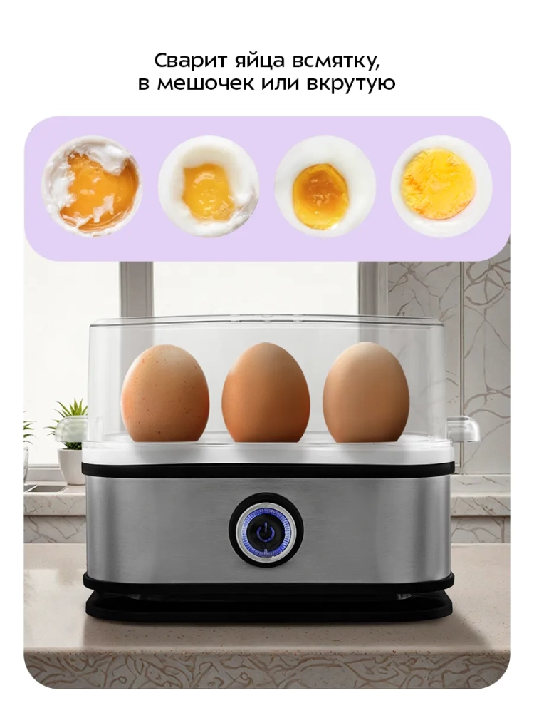 В данной яйцеварке вы можете варить до 6 яиц одновременно. Основание с углублениями для яиц делает приготовление яиц более удобным