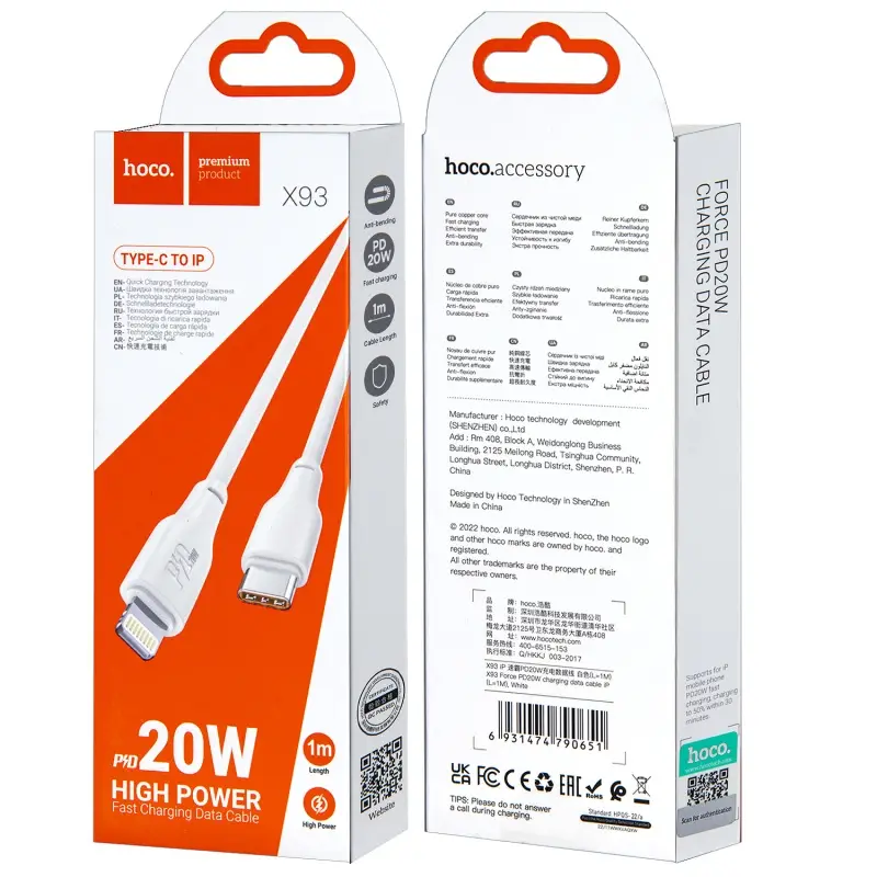 Кабель Type-C на Lightning 1M 20W X93 HOCO белый