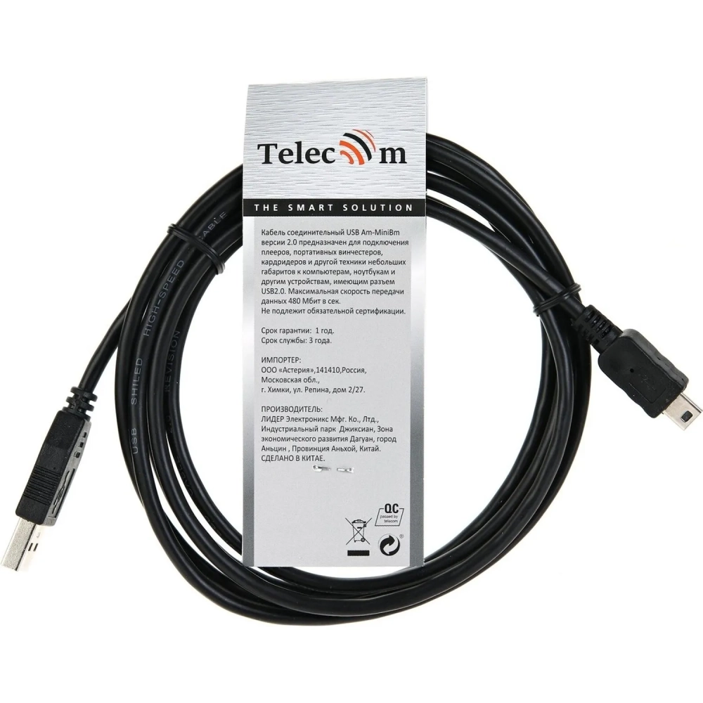 Кабель USB 2.0 A-->mini-B 5P (1,8м) чёрный, Telecom <TC6911BK-1.8M