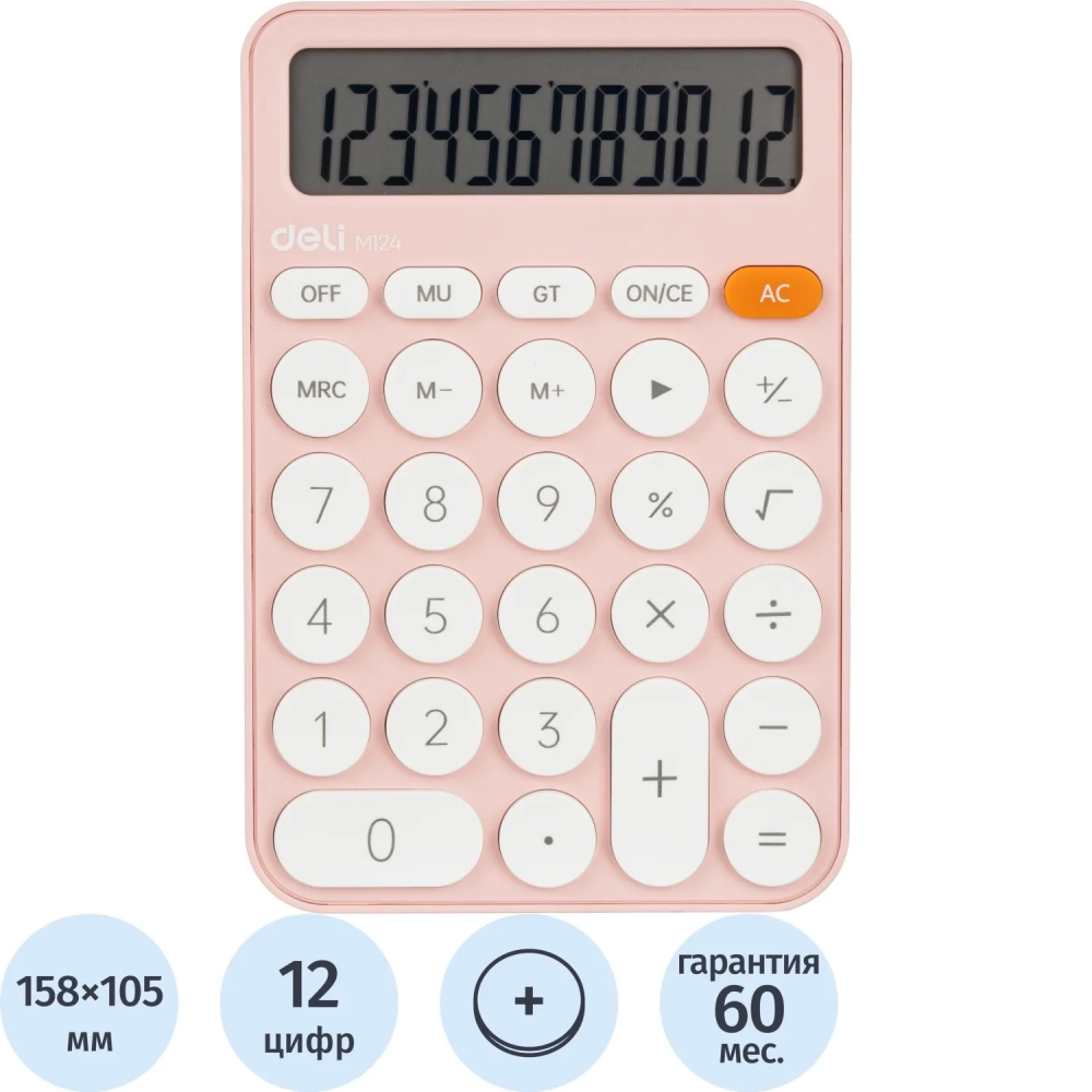 Калькулятор настольный КОМП. Deli EM124, 12-р, батар., 158х105мм, розовый
