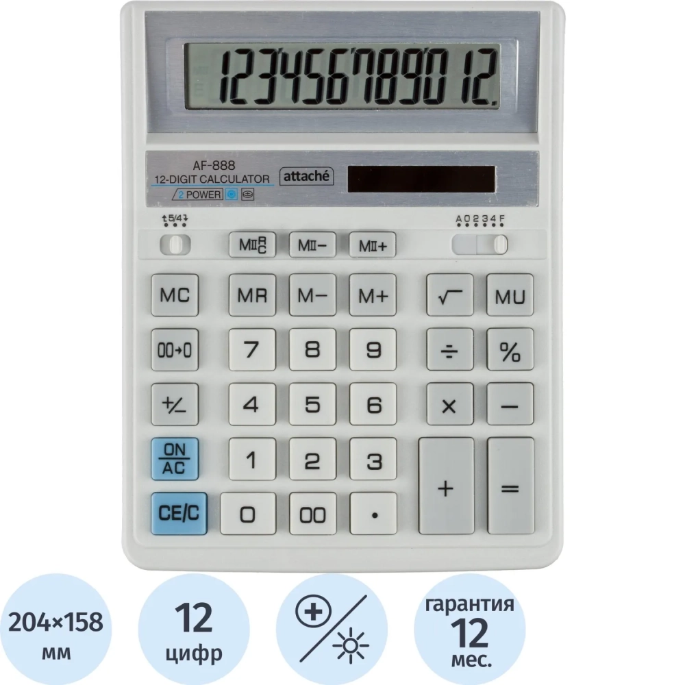 Калькулятор настольный ПОЛН/Р Attache AF-888,12р,дв.пит,204x158мм, белый