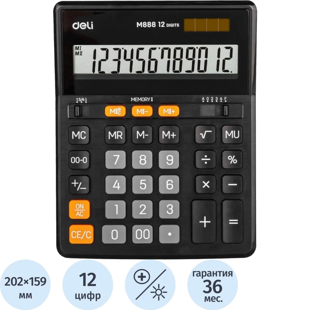 Калькулятор настольный ПОЛНОРАЗМ. Deli EM888, 12-р,дв.пит, 202х159мм,черн