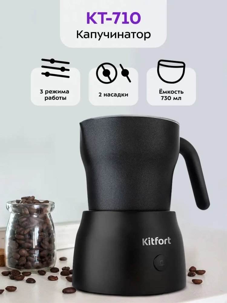 Капучинатор Kitfort КТ-710 — это устройство для приготовления молочной пенки. Он работает в трех режимах: горячее вспенивание, холодное вспенивание и подогрев. Кроме вспенивания и подогрева молока капучинатор можно использовать для приготовления горячего шоколада, какао, разогревания и смешивания соусов.