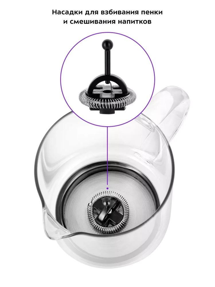 Капучинатор автоматически отключается, когда процесс приготовления выполнен. Также вы можете остановить процесс приготовления вручную. Управление осуществляется с помощью двух кнопок на моторном блоке прибора. Через прозрачные стенки питчера можно наблюдать за процессом приготовления.
