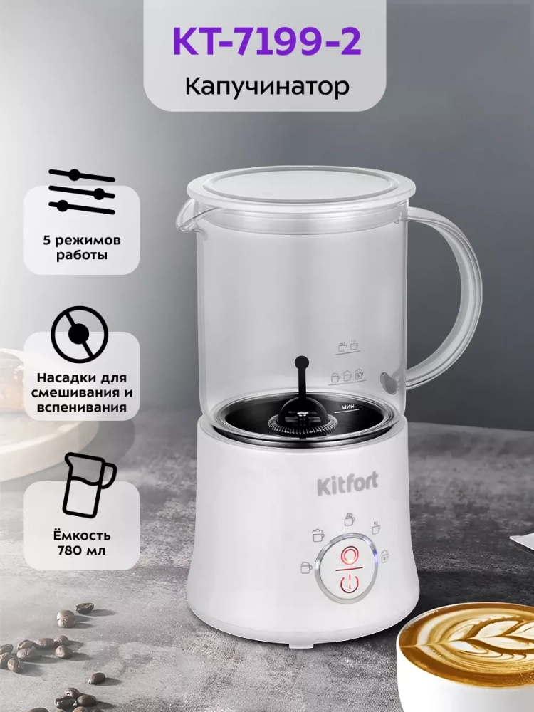 Капучинатор Kitfort КТ-7199 — это устройство для приготовления молочной пенки, используемой для напитков на базе эспрессо: капучино, латте и латте макиато. Прибор работает в 5 режимах: плотная или воздушная молочная пенка с подогревом, а также приготовление горячего шоколада, смешивание с подогревом и вспенивание без подогрева.