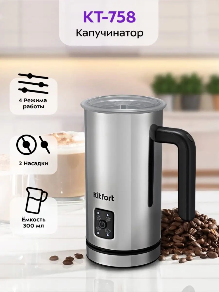 Капучинатор электрический КТ-758 от Kitfort — это незаменимый гаджет для кухни, который поможет вам приготовить идеальную молочную пенку для ваших любимых кофейных напитков. Этот капучинатор электрический предназначен для использования с кофе, таких как капучино, латте и латте макиато. Устройство работает в четырех режимах: горячее и холодное вспенивание, а также смешивание с подогревом и без него. Это делает его универсальным инструментом на вашей кухне. Капучинатор автоматически отключается после завершения процесса вспенивания или смешивания, что обеспечивает безопасность использования. В комплекте идут две насадки: одна для вспенивания молока и другая для его смешивания. Прозрачная крышка позволяет не просто взбивать но и наблюдать за процессом приготовления пенки. Этот капучинатор электрический идеально подходит тем, кто не хочет тратить время на освоение сложного процесса самостоятельного взбивания молока или следить за температурой жидкости. Просто налейте нужное количество молока в устройство и нажмите кнопку — через несколько минут вы получите густую холодную или горячую пену. Кроме того, этот капучинатор можно использовать не только как вспениватель молока; он также отлично справляется с приготовлением какао и смешиванием различных жидкостей. Это делает его многофункциональным прибором среди товаров для кухни и дома. Если вы ищете надежные гаджеты или просто хотите пополнить свою коллекцию кухонных аксессуаров современным устройством, то этот капучинатор аккумуляторный станет отличным выбором! Он сочетает в себе функции ручного венчика для взбивания электрического типа китфорт с удобством автоматического управления.
