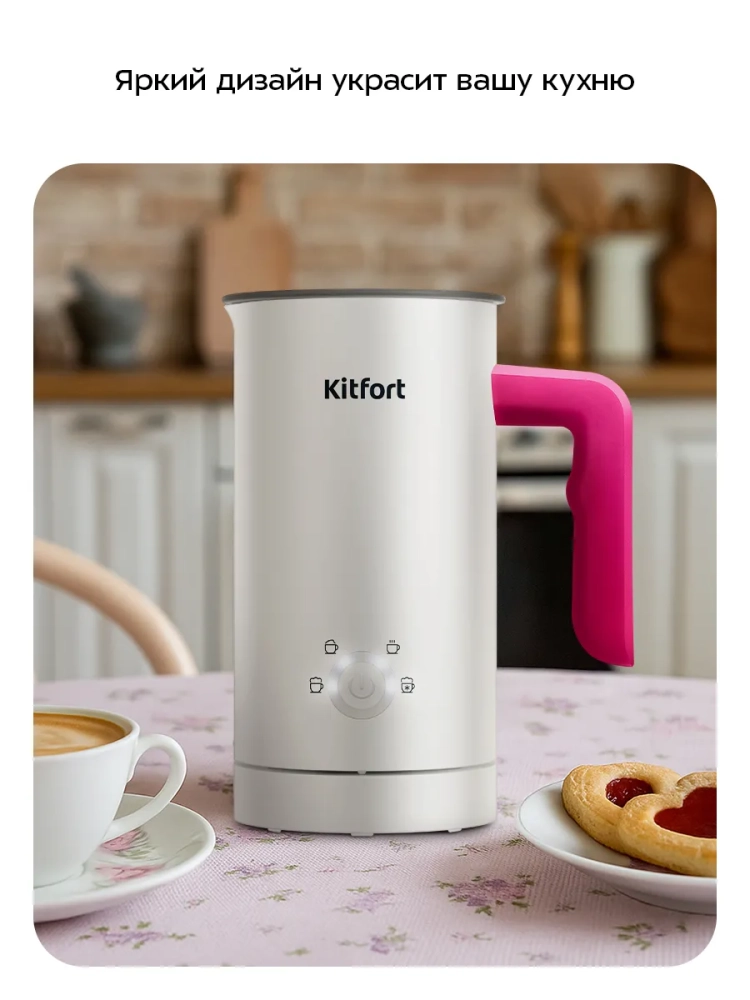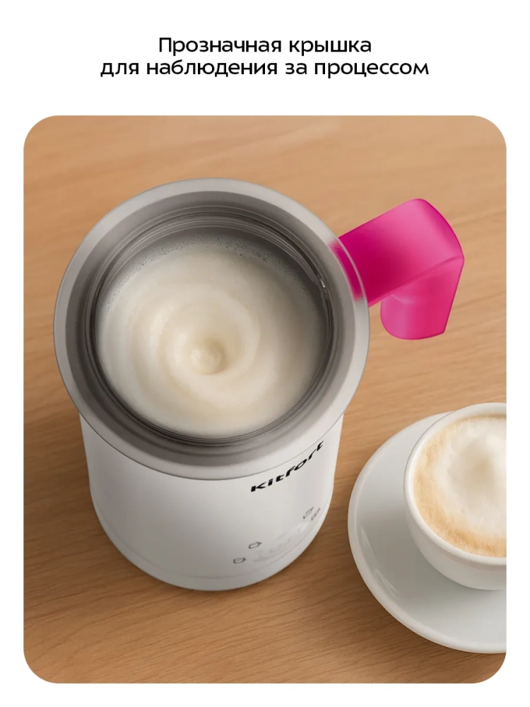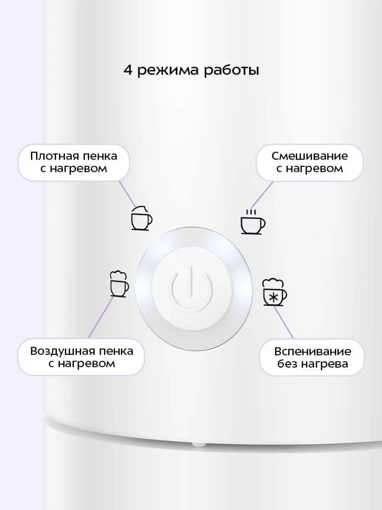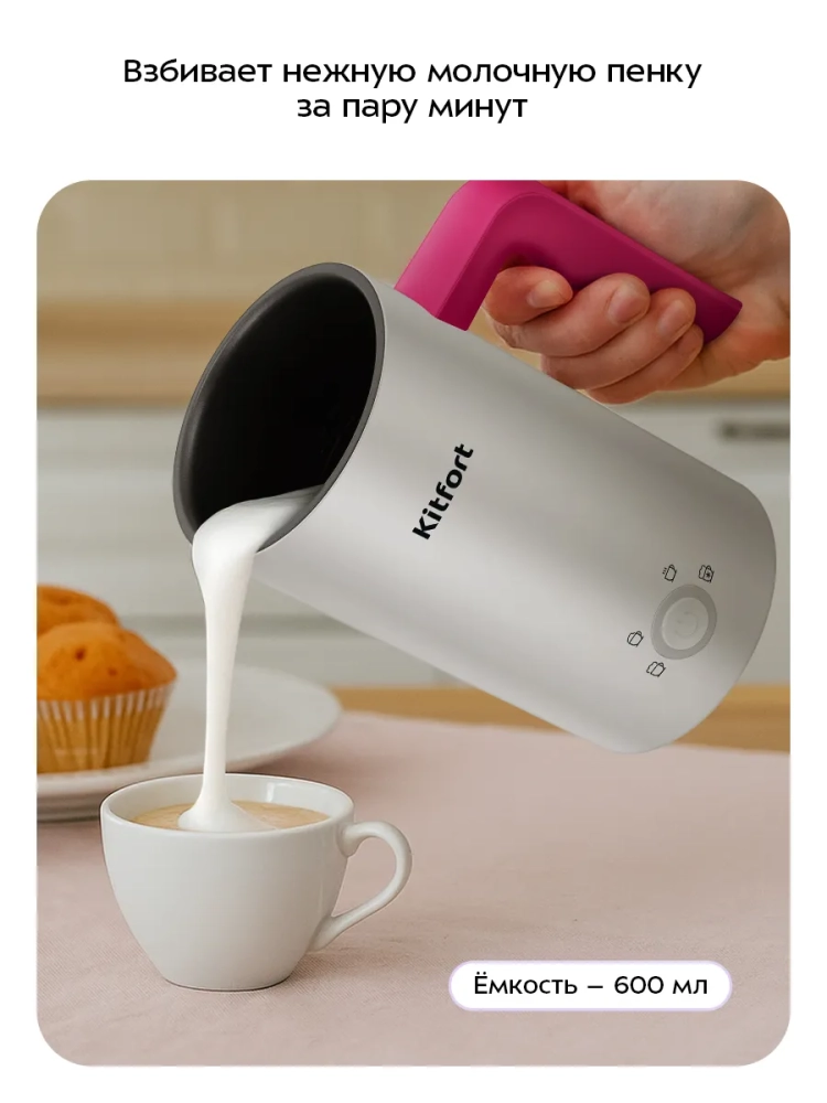 Капучинатор Kitfort КТ-7653 — это устройство для приготовления молочной пенки, используемой для напитков на базе эспрессо: капучино, латте и латте макиато. Прибор работает в 4 режимах: плотная и воздушная молочная пенка с нагревом, смешивание с нагревом и вспенивание без нагрева.