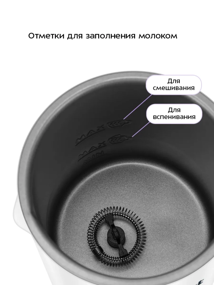 Капучинатор автоматически отключается, когда процесс взбивания или смешивания выполнен. Также вы можете остановить процесс приготовления вручную. Управление осуществляется с помощью одной кнопки. Через прозрачную крышку можно наблюдать за приготовлением.