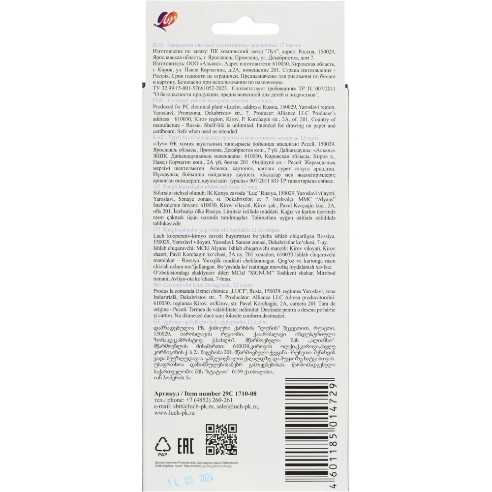 Карандаши цветные 12 цв, 6-гран, ЛУЧ Классика, 29С 1710-08