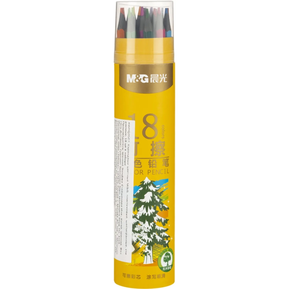 Карандаши цветные M&G, пластиковые, шестигран, стираемые, 18 цв/наб, в тубе