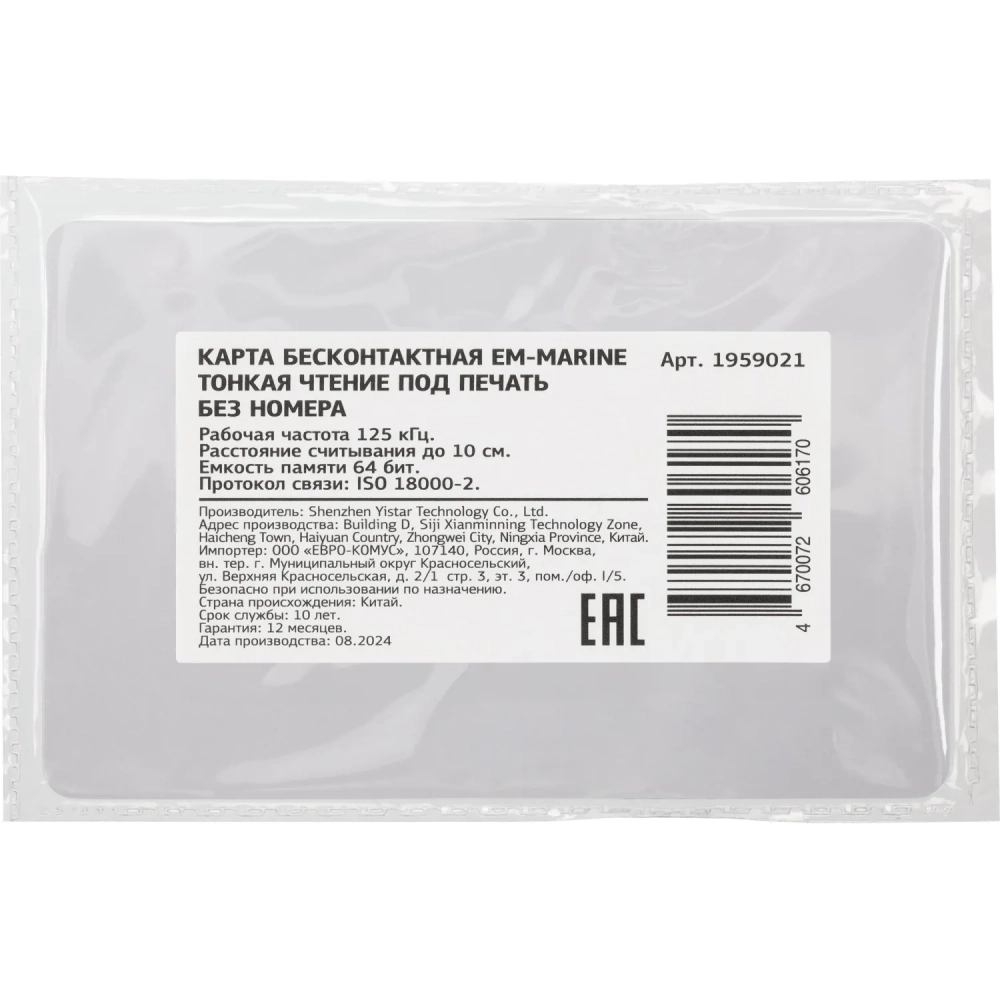 Карта бесконтактная EM-Marine тонкая чтение под печ. без номера