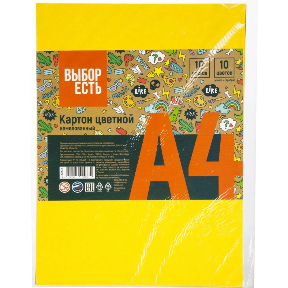 Картон цветной 10л.10цв.А4 немелов(золото+сереб) Отличник