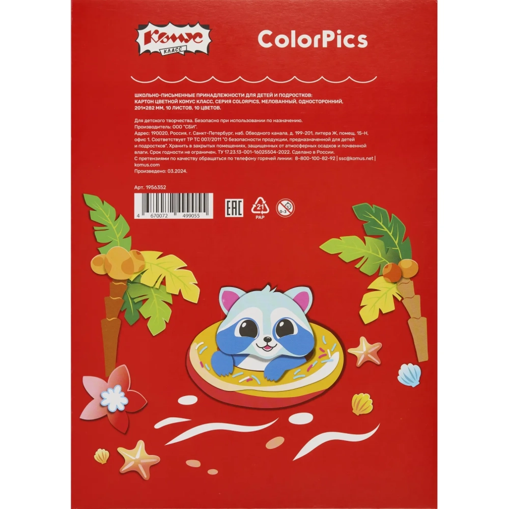 Картон цветной Комус Класс ColorPics 10л 10цв А4 мелован..папка