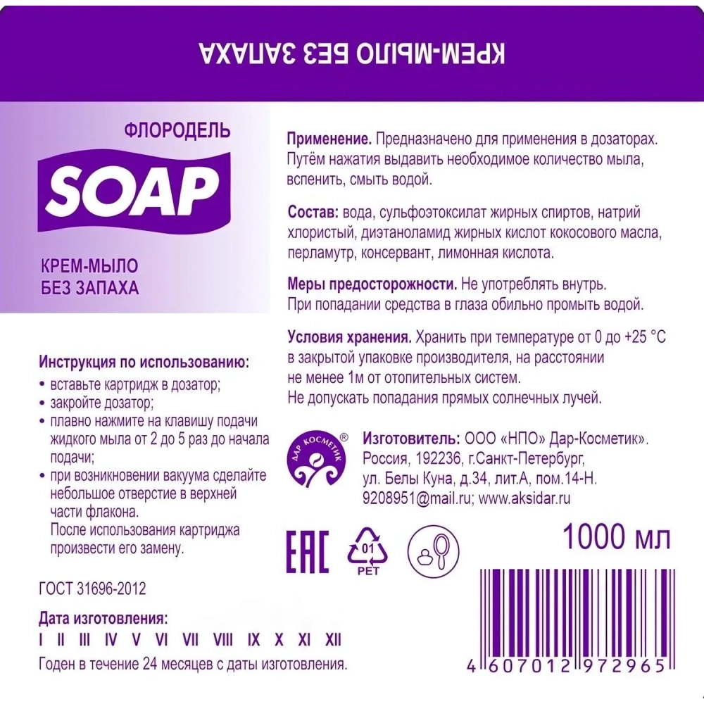 Картридж с жидким мылом Флородель крем-мыло без запаха S1 1000мл