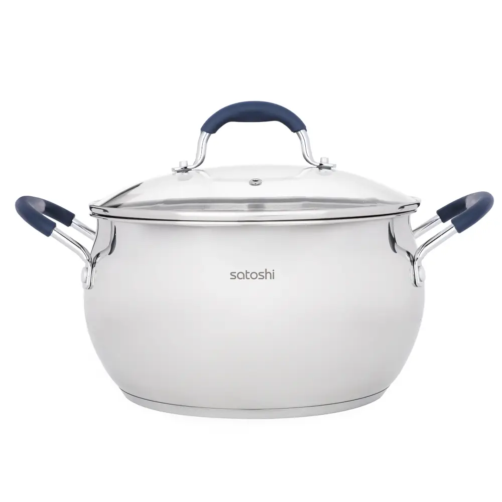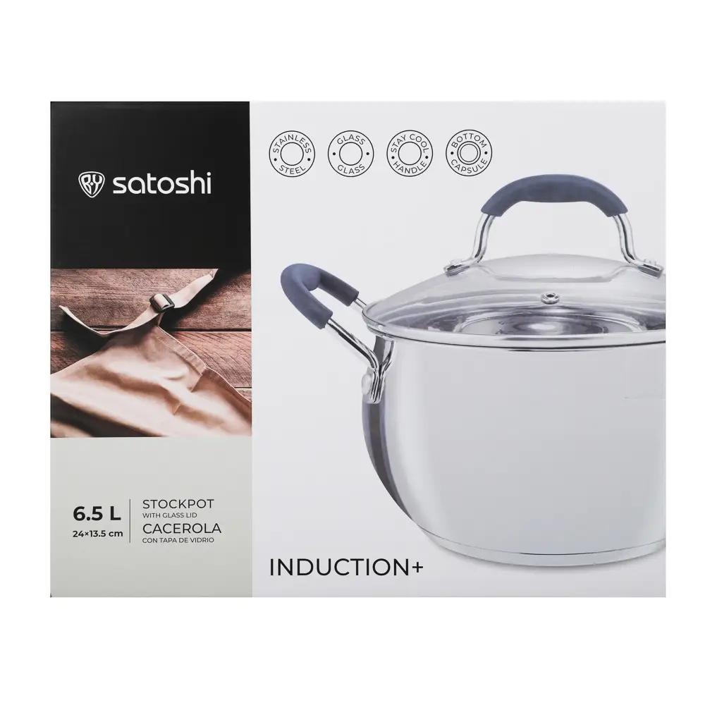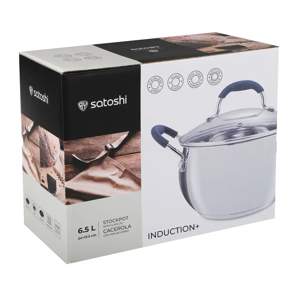 Кастрюля SATOSHI Альба – вместительная посуда объемом 6,5 л, идеально подходящая для приготовления супов, каш, компотов и других блюд для всей семьи. Изготовленная из высококачественной нержавеющей стали, она прослужит вам долгие годы. Ее диаметр 24 см и высота 13,5 см обеспечат комфортное приготовление даже больших порций. Прозрачная стеклянная крышка с удобным паровыпускным отверстием позволит вам контролировать процесс приготовления, предотвращая сильное кипение и дребезжание. Удобные ручки с силиконовыми накладками обеспечат безопасное использование, предотвращая ожоги. Кастрюля SATOSHI Альба совместима со всеми типами варочных поверхностей, включая индукционные. Готовьте с удовольствием и легкостью!. Подходит для ежедневного использования дома и на даче. Надёжная конструкция обеспечивает равномерный нагрев и удобство приготовления. Антипригарное покрытие облегчает уход и позволяет готовить с минимальным количеством масла. Совместимо с индукционными и другими типами плит.