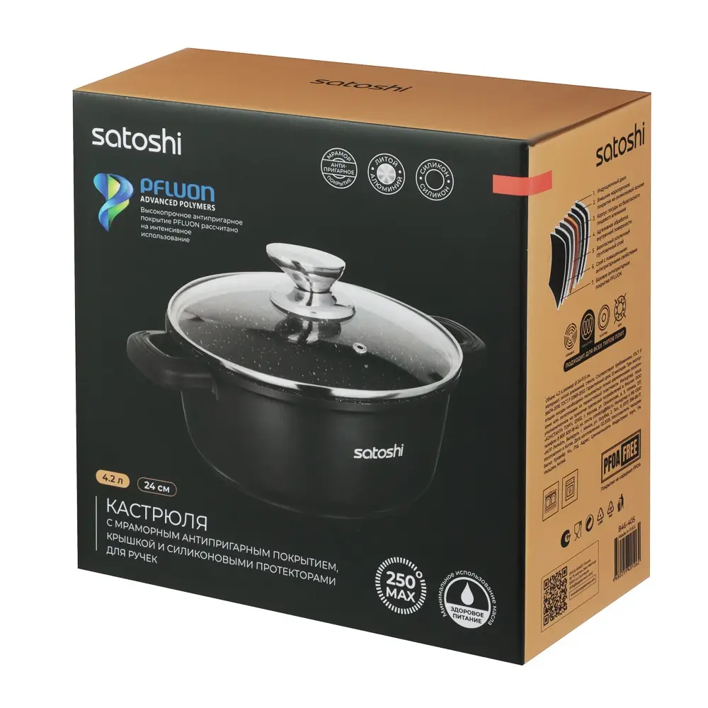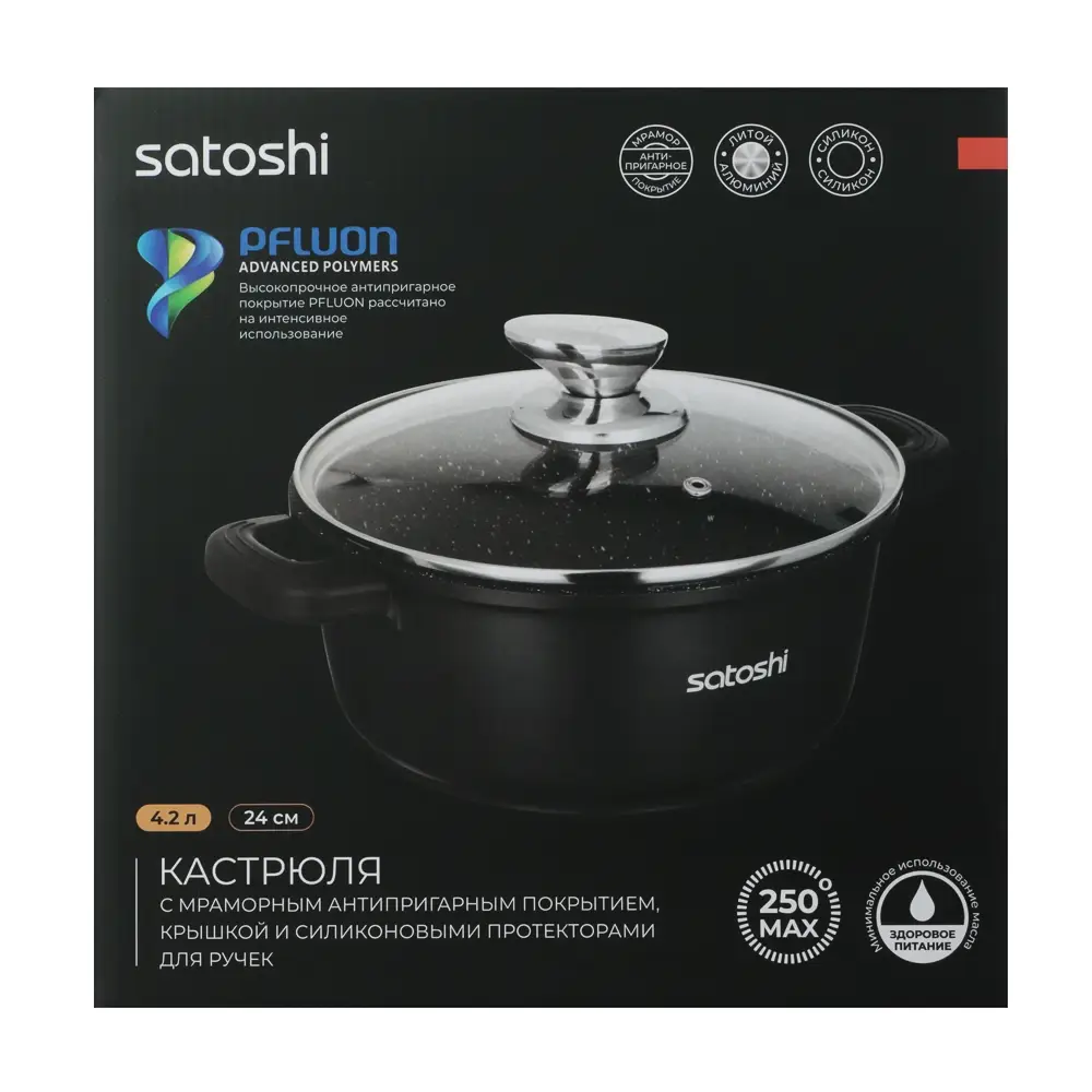 Кастрюля SATOSHI Лион, 4,2л, с крышкой d24*11, 5см, антипригарное покрытие. Мрамор, силиконовые протекторы ручек, индукция
