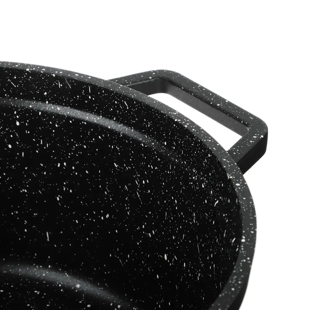 Антипригарное покрытие позволяет готовить без добавления масла, облегчает уход и очистку после использования. Казан подходит для всех типов плит, включая индукционные, что делает его удобным выбором для любой кухни.