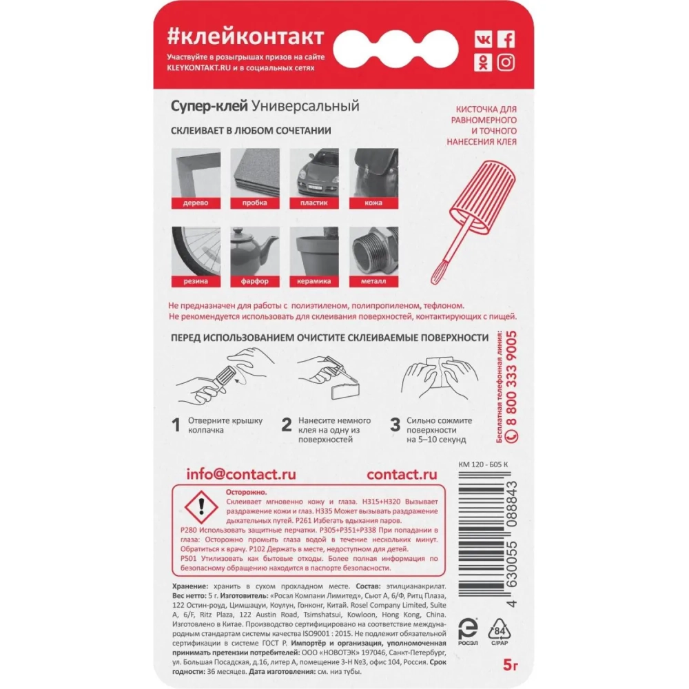 Клей универсальный секундный КОНТАКТ с кисточкой, 5 гр. КМ120-Б05К