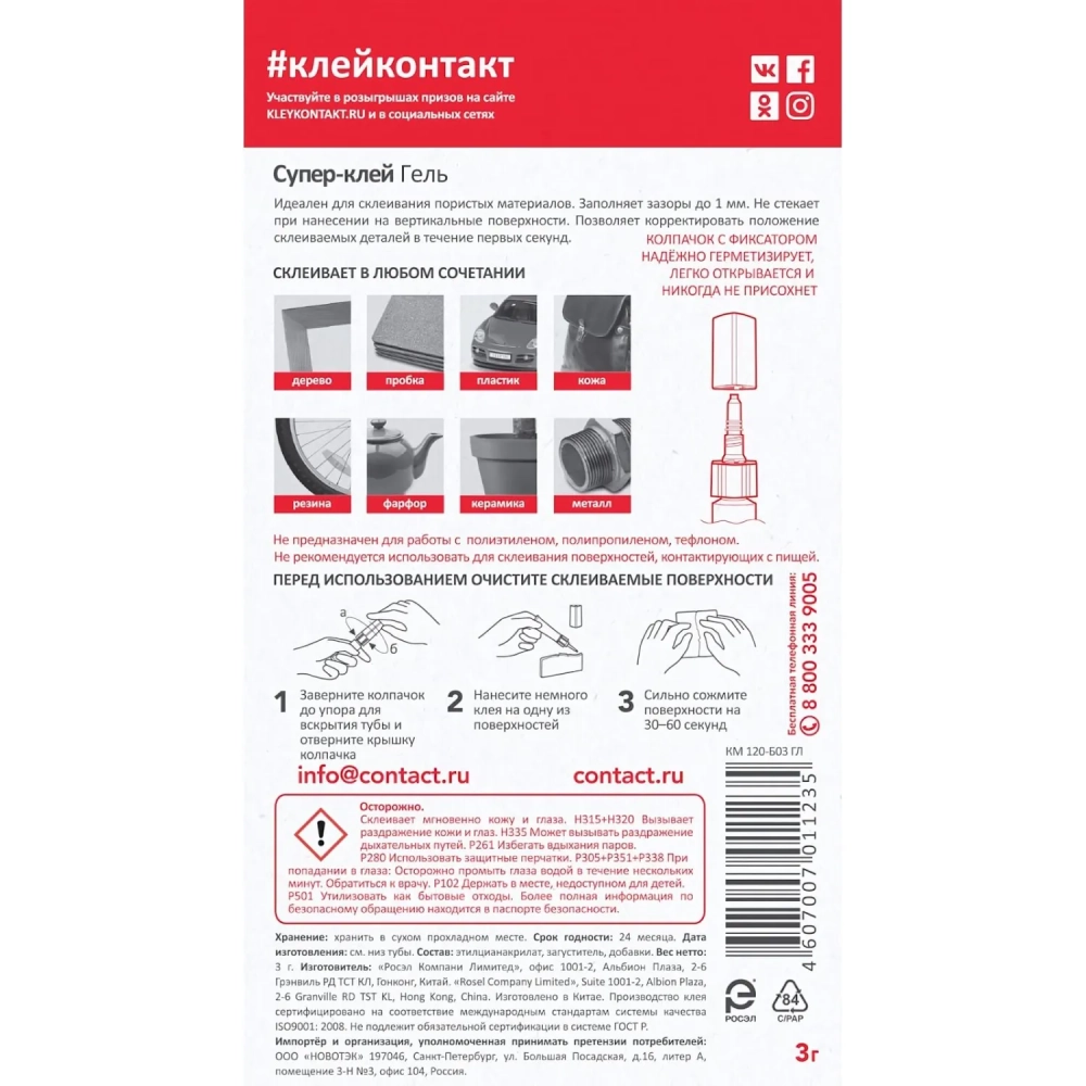Клей универсальный Супер-клей КОНТАКТ гель, 3 г, арт. КМ 288 - 312 ГЛ