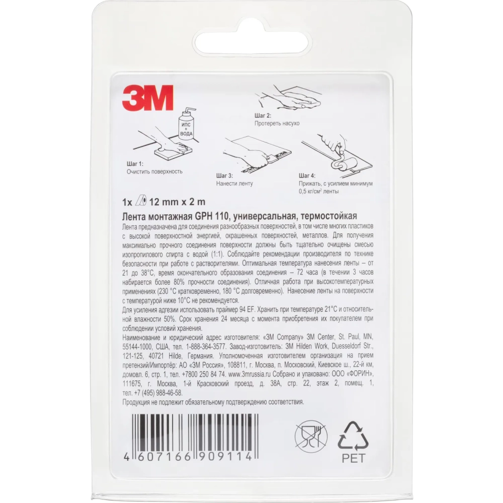 Клейкая лента 3М GPH110 монтажная двусторонняя высокотемпературная 12ммX2 м
