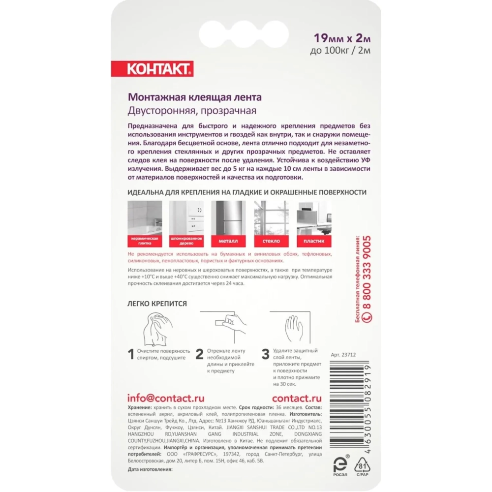 Клейкая лента двухсторонняя КОНТАКТ ДОМ 19ммх2м прозрачная (23712)