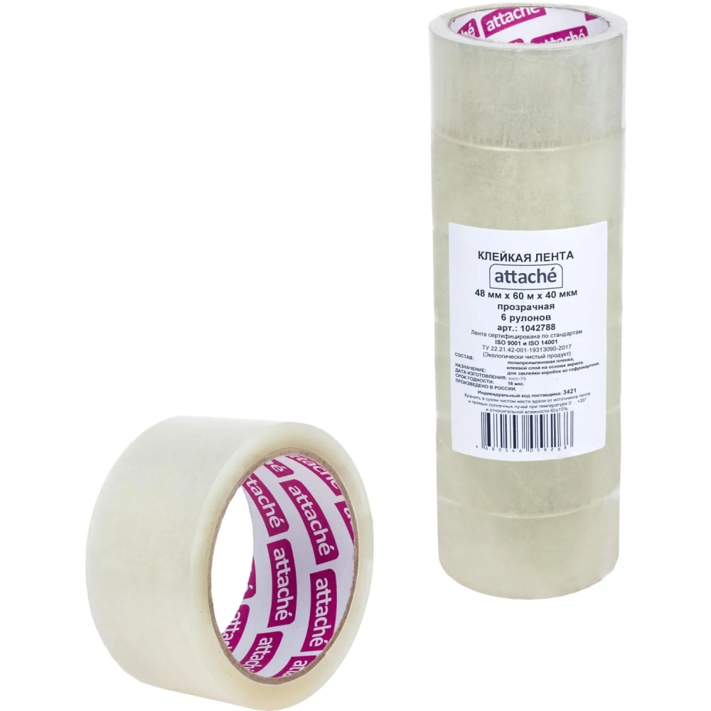 Клейкая лента упаковочная ATTACHE 48мм х 60м 40мкм прозрачная 6 шт/уп