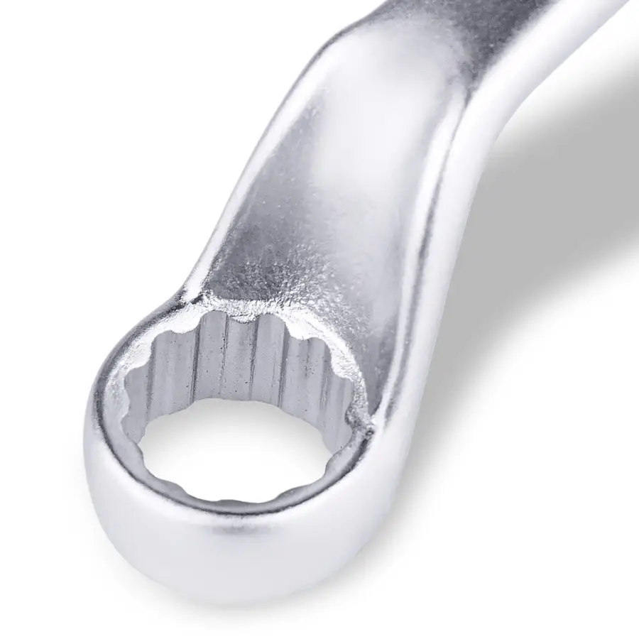 Накидной ключ – это рукоять и зажимная часть, которая охватывает весь периметр гайки. Он более удобен в эксплуатации и надежнее фиксирует крепеж, чем рожковый. Применяется для работ с высоконагруженными резьбовыми соединениями. Изогнутая на 75° коленчатая рабочая часть облегчает доступ в труднодоступные места. Кольцевые ключи имеют 12 граней. 12-тигранный ключ более распространен в использовании (поворот на 30 градусов). Из-за большого пятна контакта вероятность деформации углов сведена к нулю. Ключи изготавливаются из легированной хромованадиевой стали по стандарту DIN 838, в соответствии с ГОСТ 2906-80.