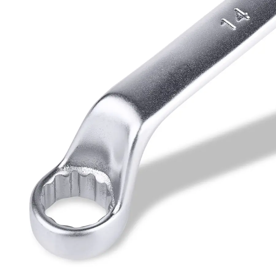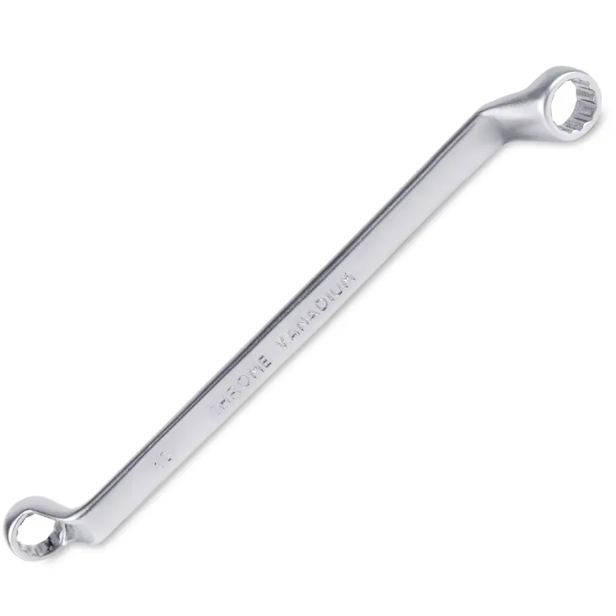 Накидной ключ – это рукоять и зажимная часть, которая охватывает весь периметр гайки. Он более удобен в эксплуатации и надежнее фиксирует крепеж, чем рожковый. Применяется для работ с высоконагруженными резьбовыми соединениями. Изогнутая на 75° коленчатая рабочая часть облегчает доступ в труднодоступные места. Кольцевые ключи имеют 12 граней. 12-тигранный ключ более распространен в использовании (поворот на 30 градусов). Из-за большого пятна контакта вероятность деформации углов сведена к нулю. Ключи изготавливаются из легированной хромованадиевой стали по стандарту DIN 838, в соответствии с ГОСТ 2906-80.