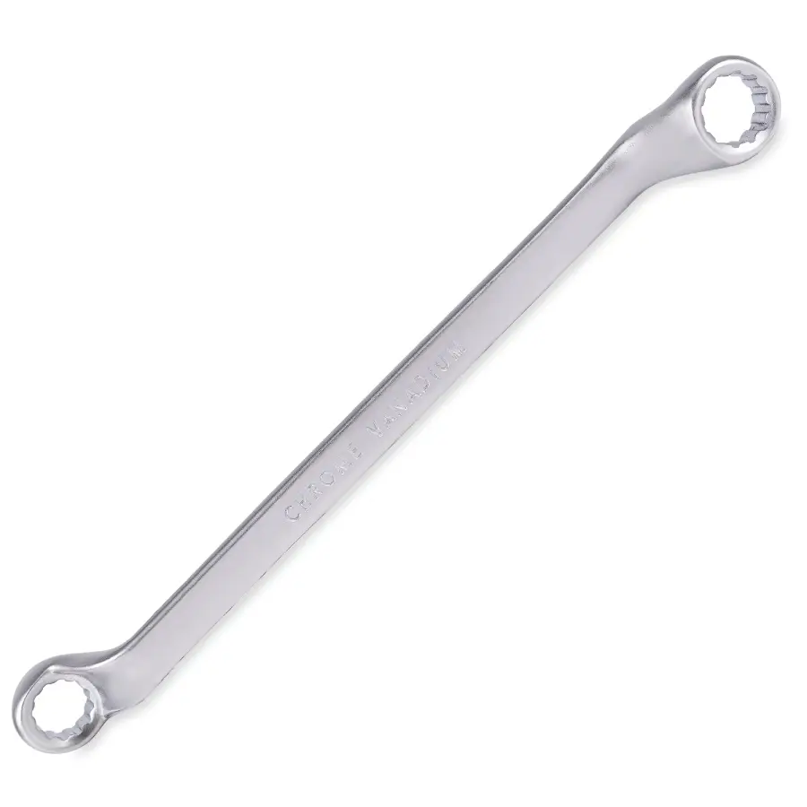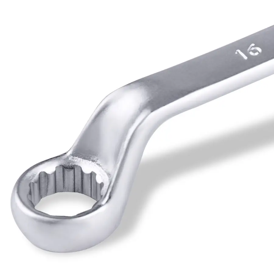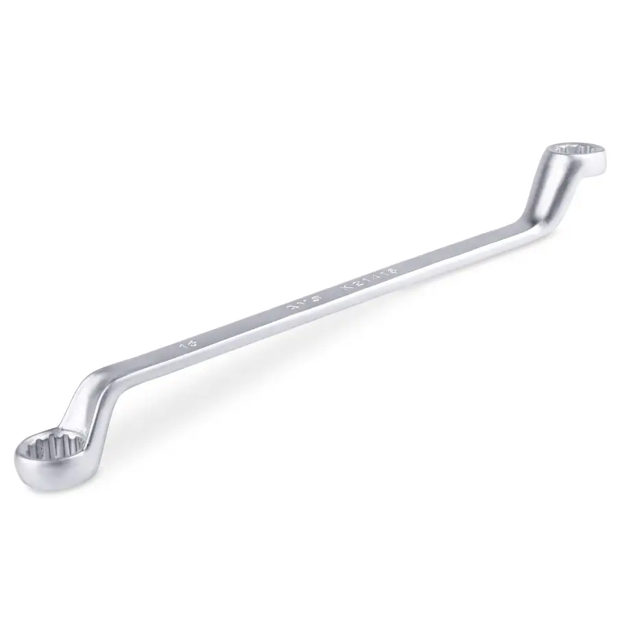Накидной ключ – это рукоять и зажимная часть, которая охватывает весь периметр гайки. Он более удобен в эксплуатации и надежнее фиксирует крепеж, чем рожковый. Применяется для работ с высоконагруженными резьбовыми соединениями. Изогнутая на 75° коленчатая рабочая часть облегчает доступ в труднодоступные места. Кольцевые ключи имеют 12 граней. 12-тигранный ключ более распространен в использовании (поворот на 30 градусов). Из-за большого пятна контакта вероятность деформации углов сведена к нулю. Ключи изготавливаются из легированной хромованадиевой стали по стандарту DIN 838, в соответствии с ГОСТ 2906-80.