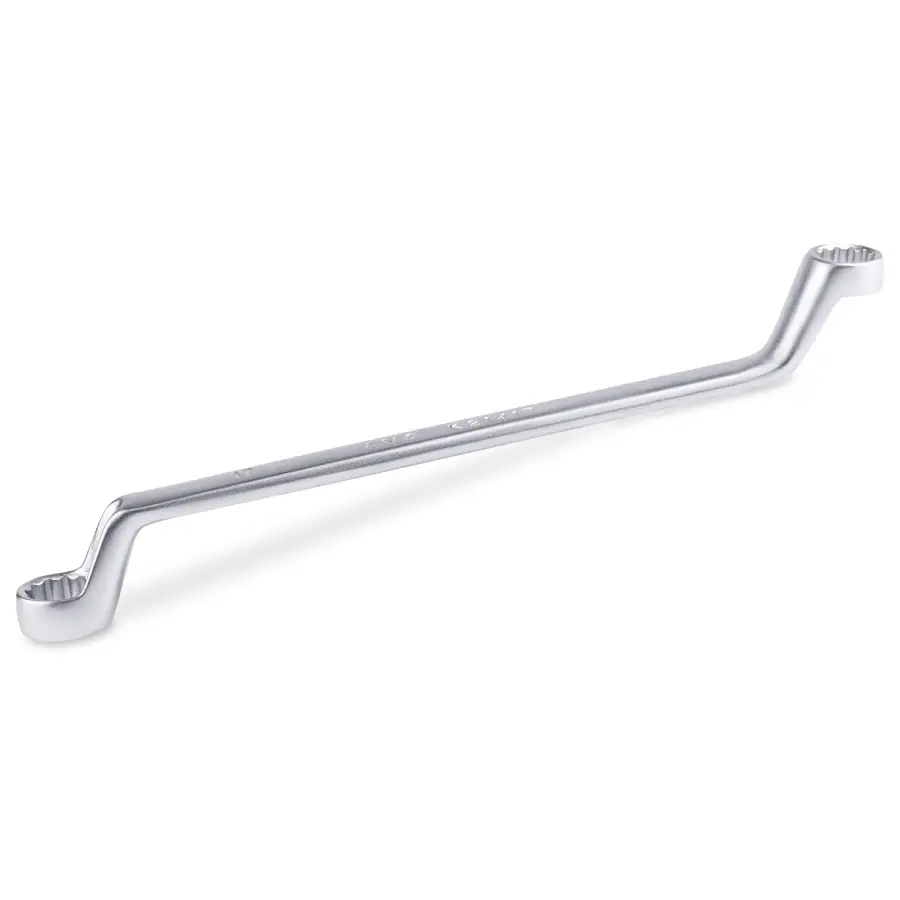 Накидной ключ – это рукоять и зажимная часть, которая охватывает весь периметр гайки. Он более удобен в эксплуатации и надежнее фиксирует крепеж, чем рожковый. Применяется для работ с высоконагруженными резьбовыми соединениями. Изогнутая на 75° коленчатая рабочая часть облегчает доступ в труднодоступные места. Кольцевые ключи имеют 12 граней. 12-тигранный ключ более распространен в использовании (поворот на 30 градусов). Из-за большого пятна контакта вероятность деформации углов сведена к нулю. Ключи изготавливаются из легированной хромованадиевой стали по стандарту DIN 838, в соответствии с ГОСТ 2906-80.