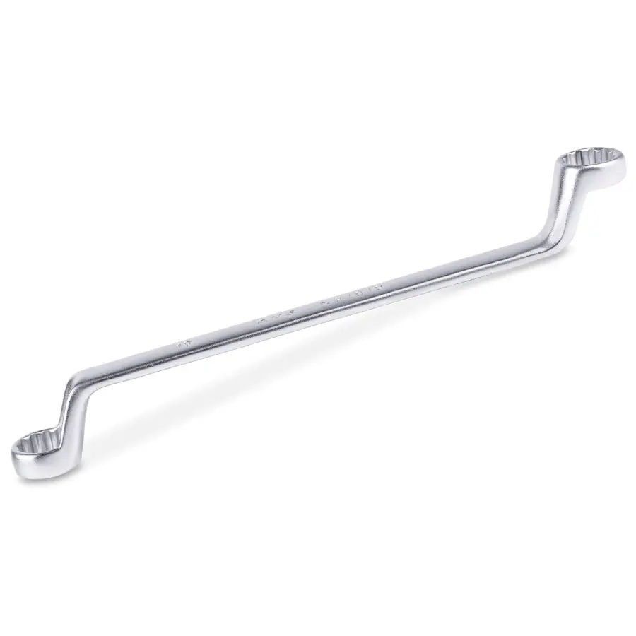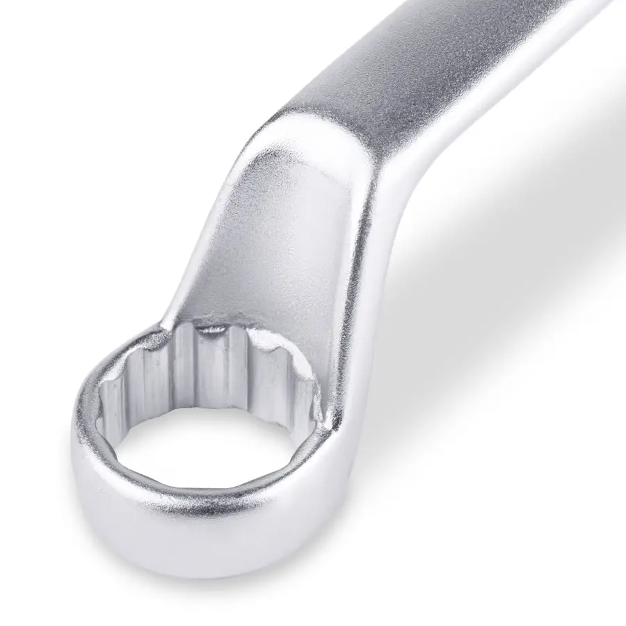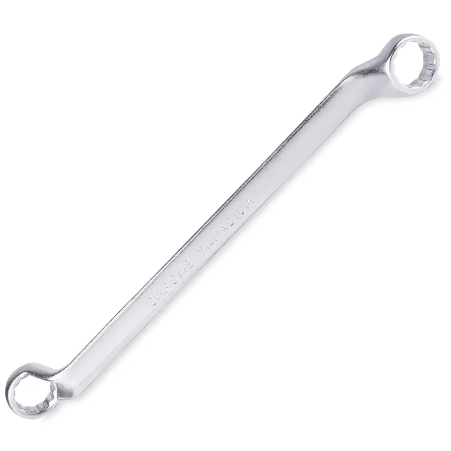 Накидной ключ – это рукоять и зажимная часть, которая охватывает весь периметр гайки. Он более удобен в эксплуатации и надежнее фиксирует крепеж, чем рожковый. Применяется для работ с высоконагруженными резьбовыми соединениями. Изогнутая на 75° коленчатая рабочая часть облегчает доступ в труднодоступные места. Кольцевые ключи имеют 12 граней. 12-тигранный ключ более распространен в использовании (поворот на 30 градусов). Из-за большого пятна контакта вероятность деформации углов сведена к нулю. Ключи изготавливаются из легированной хромованадиевой стали по стандарту DIN 838, в соответствии с ГОСТ 2906-80.