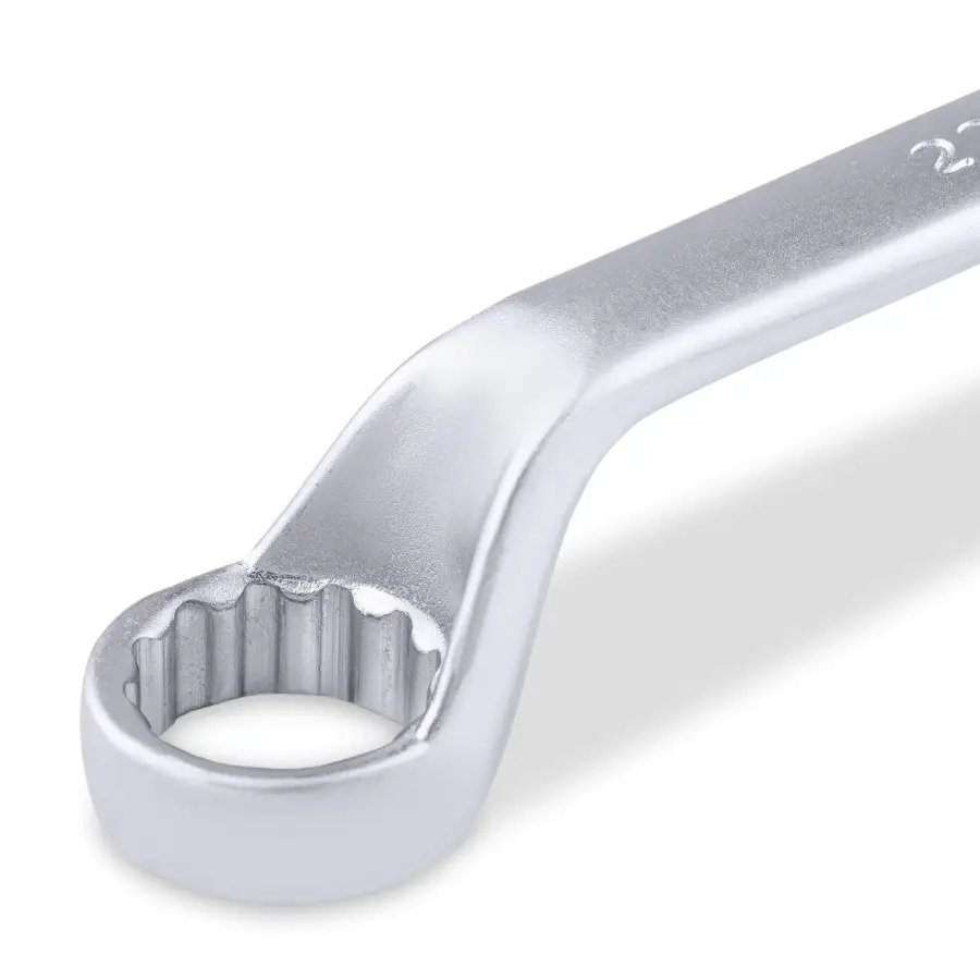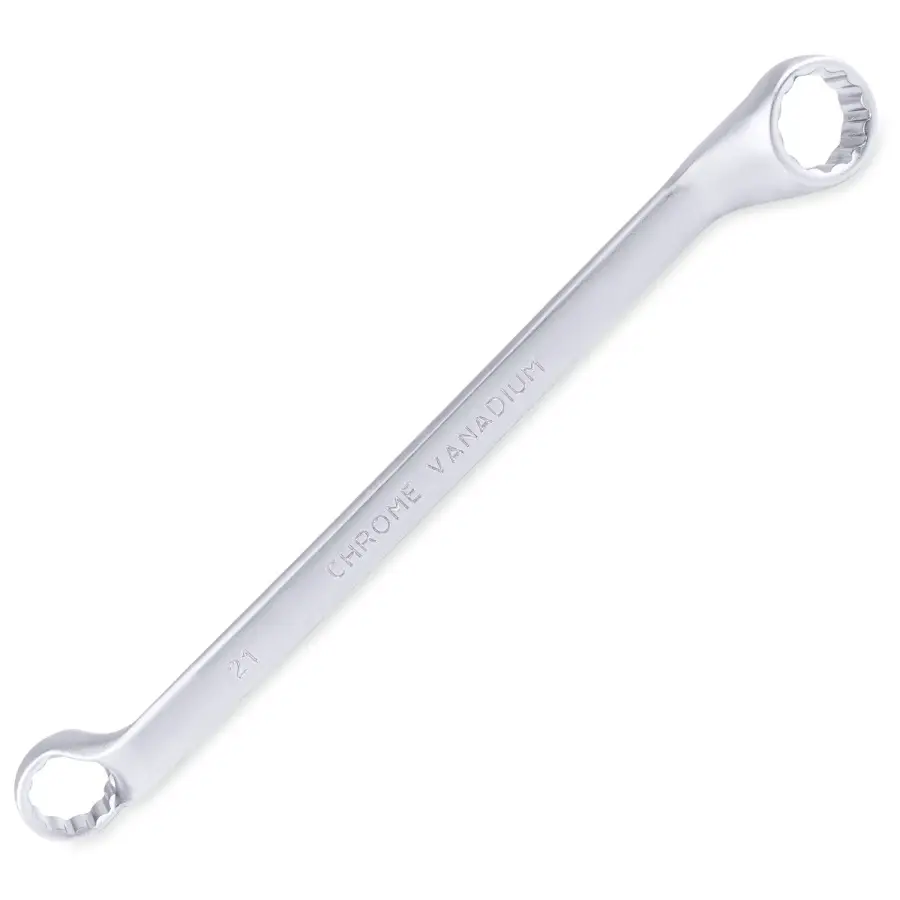 Накидной ключ – это рукоять и зажимная часть, которая охватывает весь периметр гайки. Он более удобен в эксплуатации и надежнее фиксирует крепеж, чем рожковый. Применяется для работ с высоконагруженными резьбовыми соединениями. Изогнутая на 75° коленчатая рабочая часть облегчает доступ в труднодоступные места. Кольцевые ключи имеют 12 граней. 12-тигранный ключ более распространен в использовании (поворот на 30 градусов). Из-за большого пятна контакта вероятность деформации углов сведена к нулю. Ключи изготавливаются из легированной хромованадиевой стали по стандарту DIN 838, в соответствии с ГОСТ 2906-80.