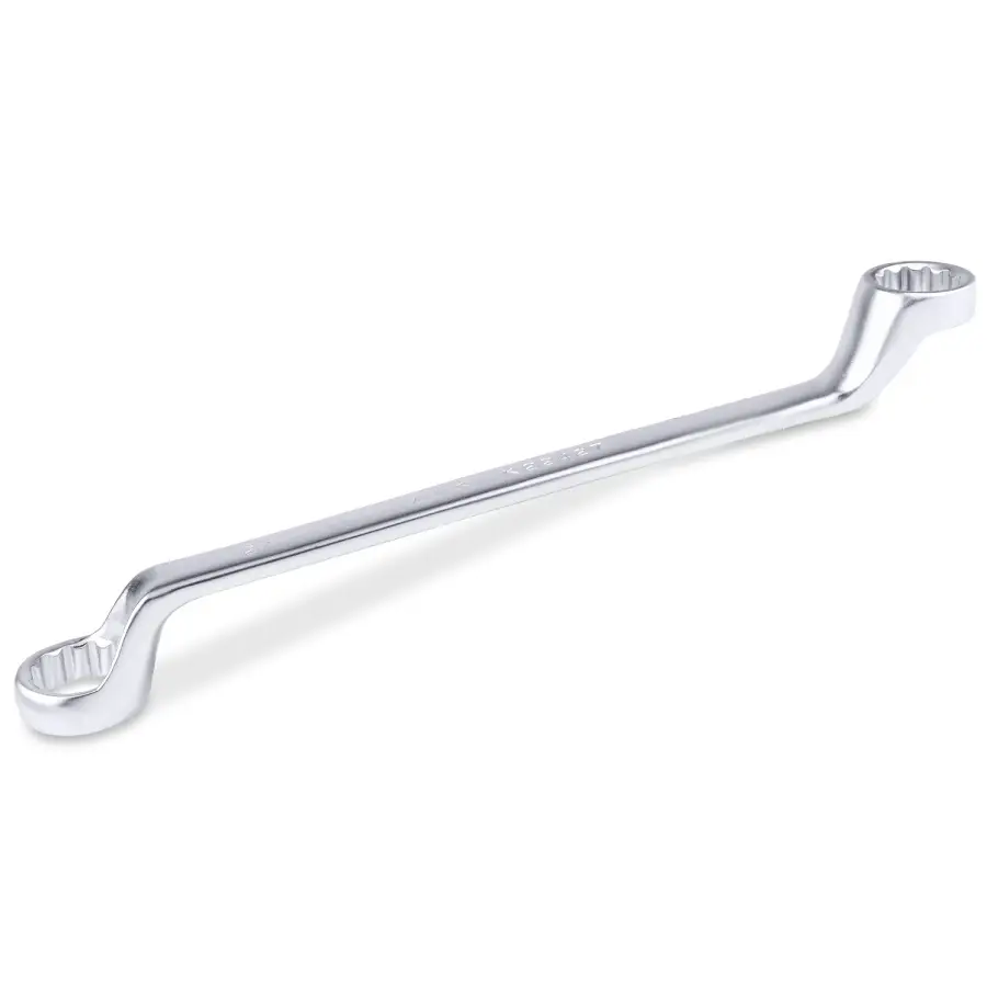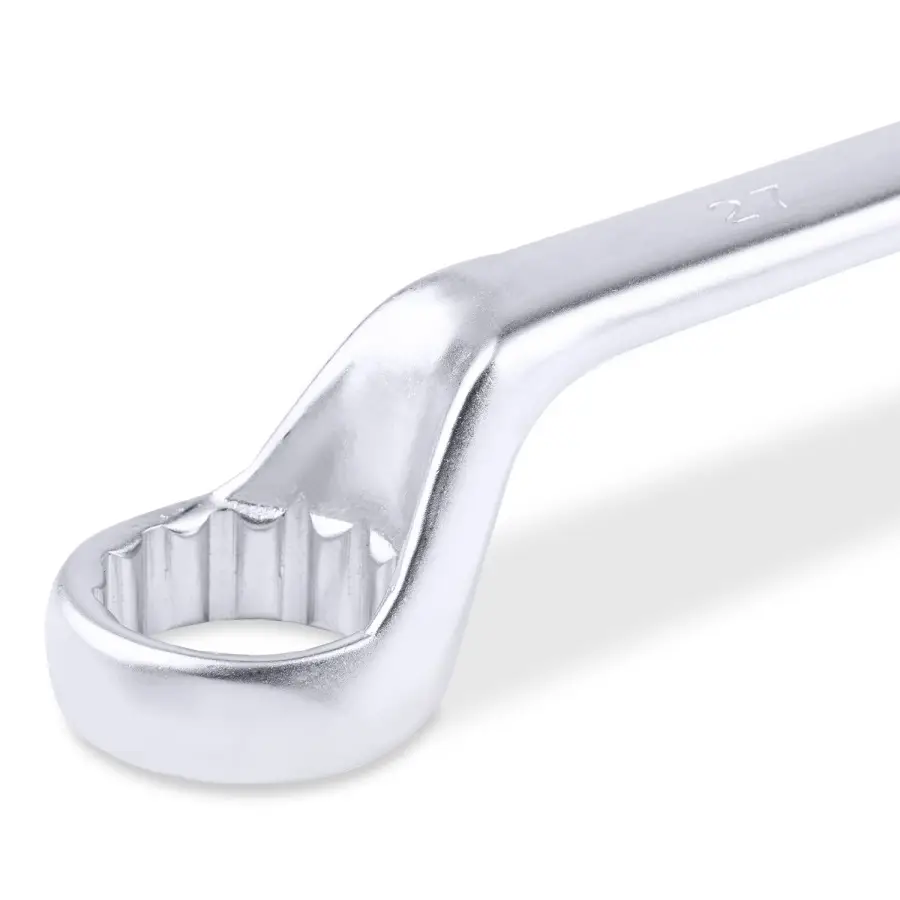 Накидной ключ – это рукоять и зажимная часть, которая охватывает весь периметр гайки. Он более удобен в эксплуатации и надежнее фиксирует крепеж, чем рожковый. Применяется для работ с высоконагруженными резьбовыми соединениями. Изогнутая на 75° коленчатая рабочая часть облегчает доступ в труднодоступные места. Кольцевые ключи имеют 12 граней. 12-тигранный ключ более распространен в использовании (поворот на 30 градусов). Из-за большого пятна контакта вероятность деформации углов сведена к нулю. Ключи изготавливаются из легированной хромованадиевой стали по стандарту DIN 838, в соответствии с ГОСТ 2906-80.