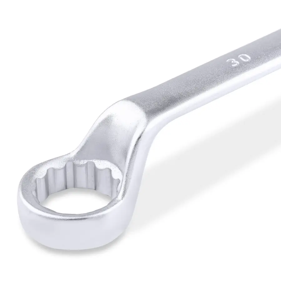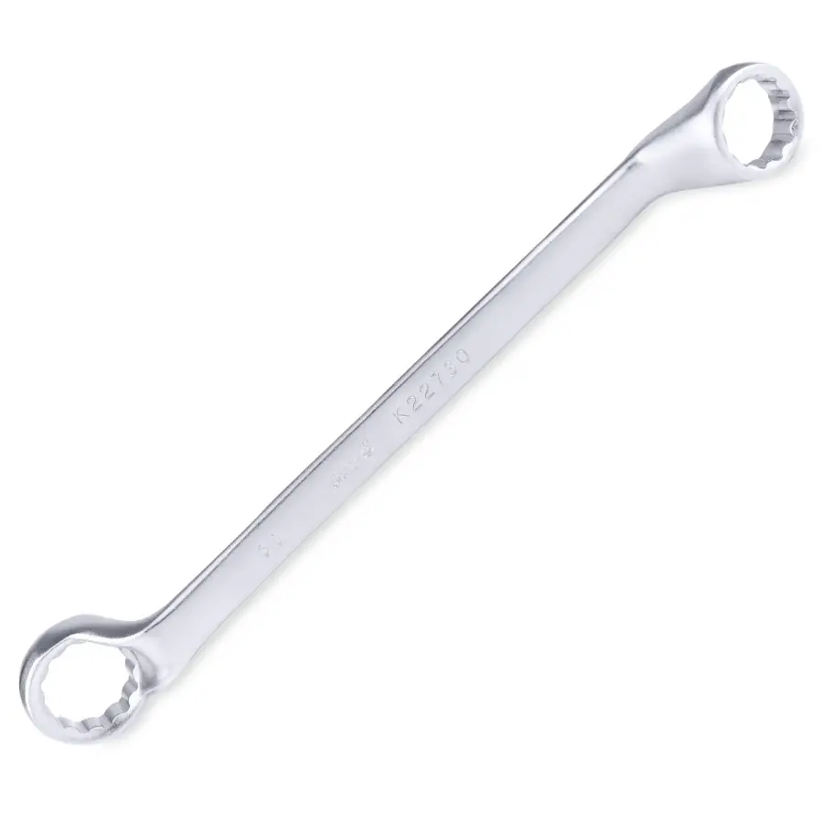 Накидной ключ – это рукоять и зажимная часть, которая охватывает весь периметр гайки. Он более удобен в эксплуатации и надежнее фиксирует крепеж, чем рожковый. Применяется для работ с высоконагруженными резьбовыми соединениями. Изогнутая на 75° коленчатая рабочая часть облегчает доступ в труднодоступные места. Кольцевые ключи имеют 12 граней. 12-тигранный ключ более распространен в использовании (поворот на 30 градусов). Из-за большого пятна контакта вероятность деформации углов сведена к нулю. Ключи изготавливаются из легированной хромованадиевой стали по стандарту DIN 838, в соответствии с ГОСТ 2906-80.