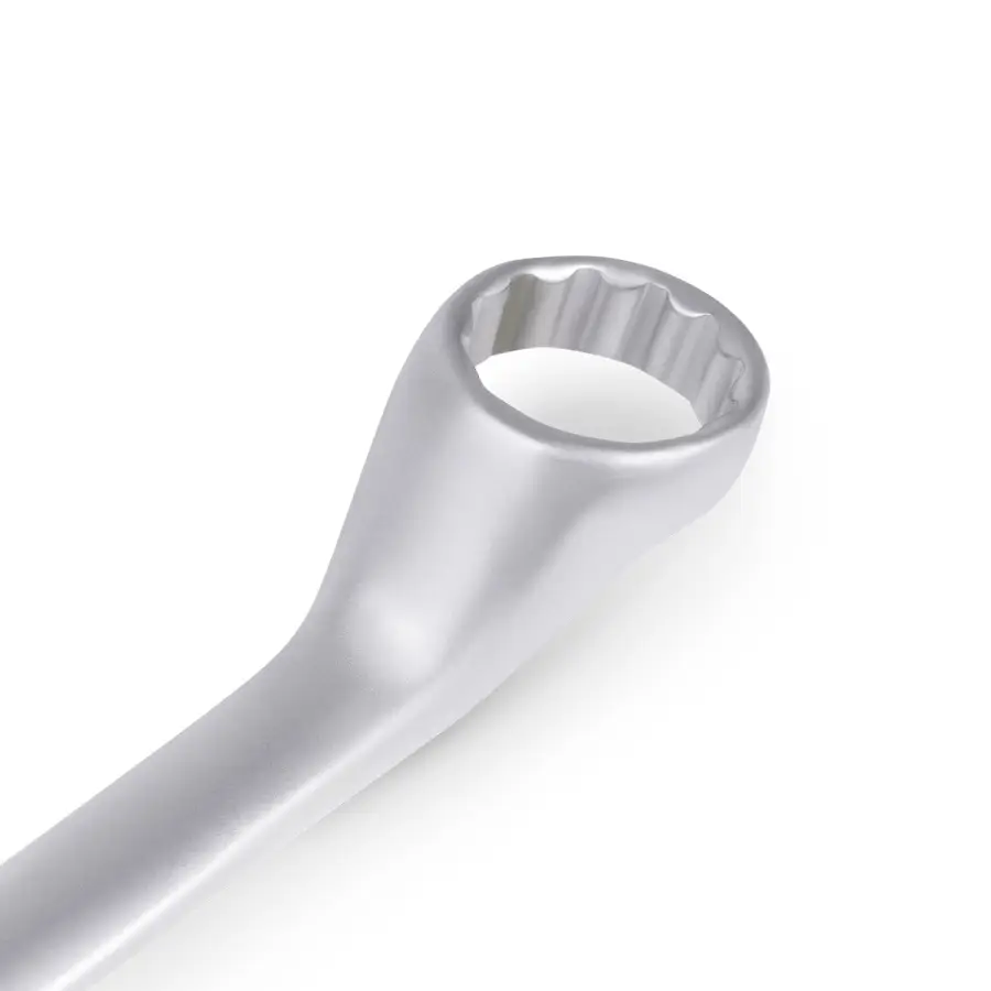 Накидной ключ – это рукоять и зажимная часть, которая охватывает весь периметр гайки. Он более удобен в эксплуатации и надежнее фиксирует крепеж, чем рожковый. Применяется для работ с высоконагруженными резьбовыми соединениями. Изогнутая на 75° коленчатая рабочая часть облегчает доступ в труднодоступные места. Кольцевые ключи имеют 12 граней. 12-тигранный ключ более распространен в использовании (поворот на 30 градусов). Из-за большого пятна контакта вероятность деформации углов сведена к нулю. Ключи изготавливаются из легированной хромованадиевой стали по стандарту DIN 838, в соответствии с ГОСТ 2906-80.