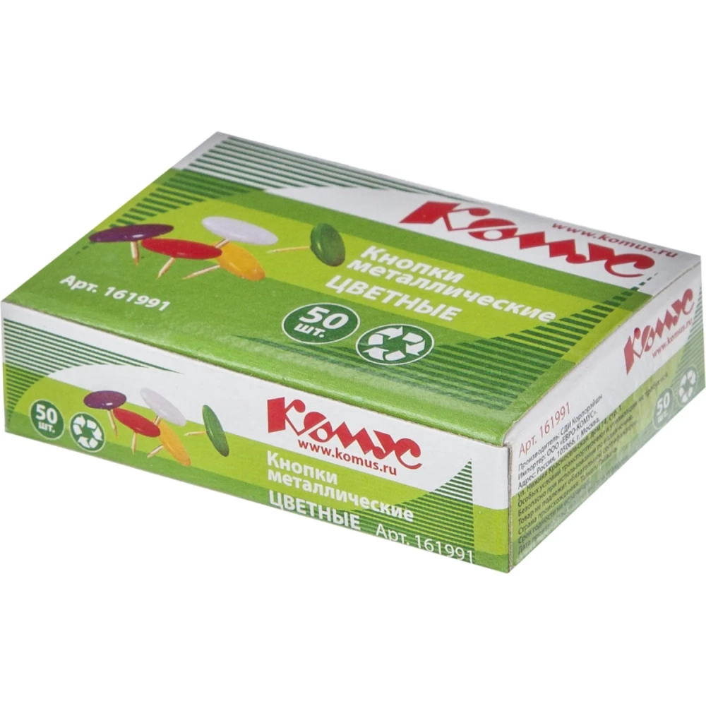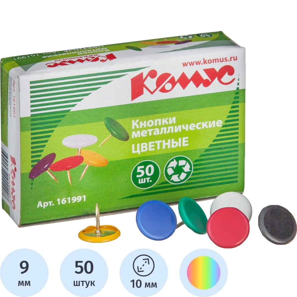Кнопки канцелярские Комус металлич. шляпка 10 мм, цветные 50 шт.карт.уп