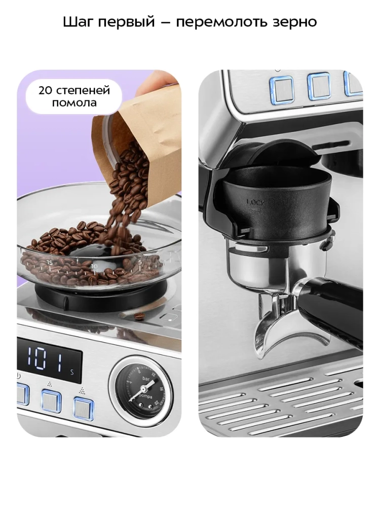 Кофейная станция Kitfort КТ-7694 сочетает в себе два устройства в одном корпусе. Встроенная кофемолка с коническими жерновами из нержавеющей стали позволяет измельчать кофейные зерна непосредственно перед приготовлением кофе, что положительно отражается на вкусе готового напитка. С помощью стимера вы можете приготовить молочную пенку, а также подогреть паром остывший чай или другие напитки. Также можно включить подачу горячей воды через стимер. Кофейная станция поможет приготовить эспрессо, а также множество других видов кофе на ваш вкус.