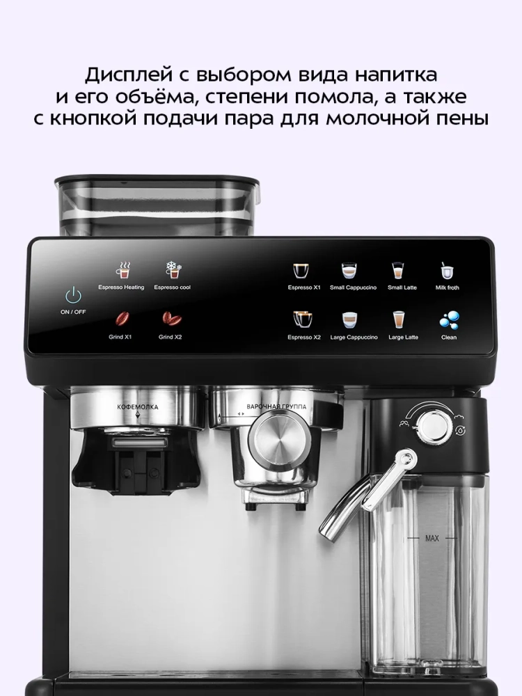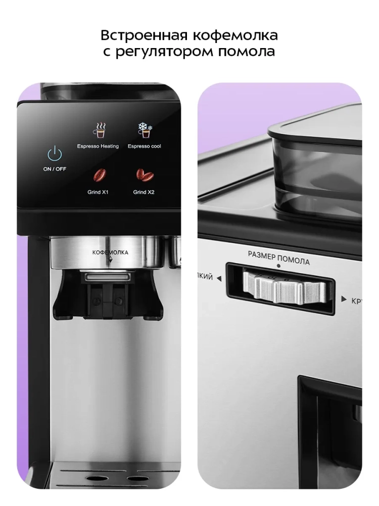 Встроенная кофемолка с коническими жерновами, которые препятствуют излишнему перегреванию зерен при помоле, позволяет получить свежемолотый кофе и настроить степень помола.